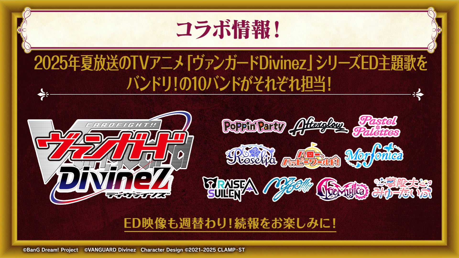 超豪華コラボが遂に実現!今夏放送のTVアニメ「カードファイト!! ヴァンガード Divinez」シリーズのEDを「BanG Dream!」の各10バンドが担当!