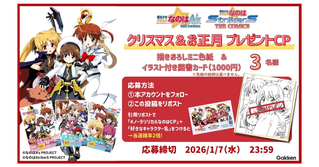Xアカウント「コミックノーラ編集部」にて、クリスマス&お正月キャンペーンを開催中。大人気『魔法少女リリカルなのは』の豪華グッズが当たるチャンス! フォロー&リポストで、簡単にご応募いただけます。