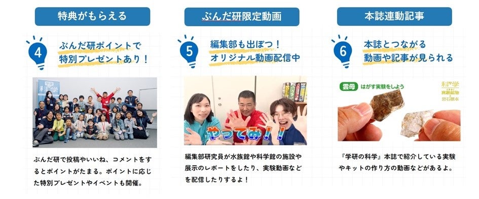 「学研の科学 あそぶんだ研究所」は、読者と編集部がいっしょになり、科学を楽しむ無料のオンラインコミュニティ。編集部による生配信のワークショップに参加できたり、キットの遊び方をみんなで投稿したり、ここでしかできないオンライン体験がもりだくさんです。小学生たちのSNSの入門としても保護者から信頼されているコミュニティサイトです。