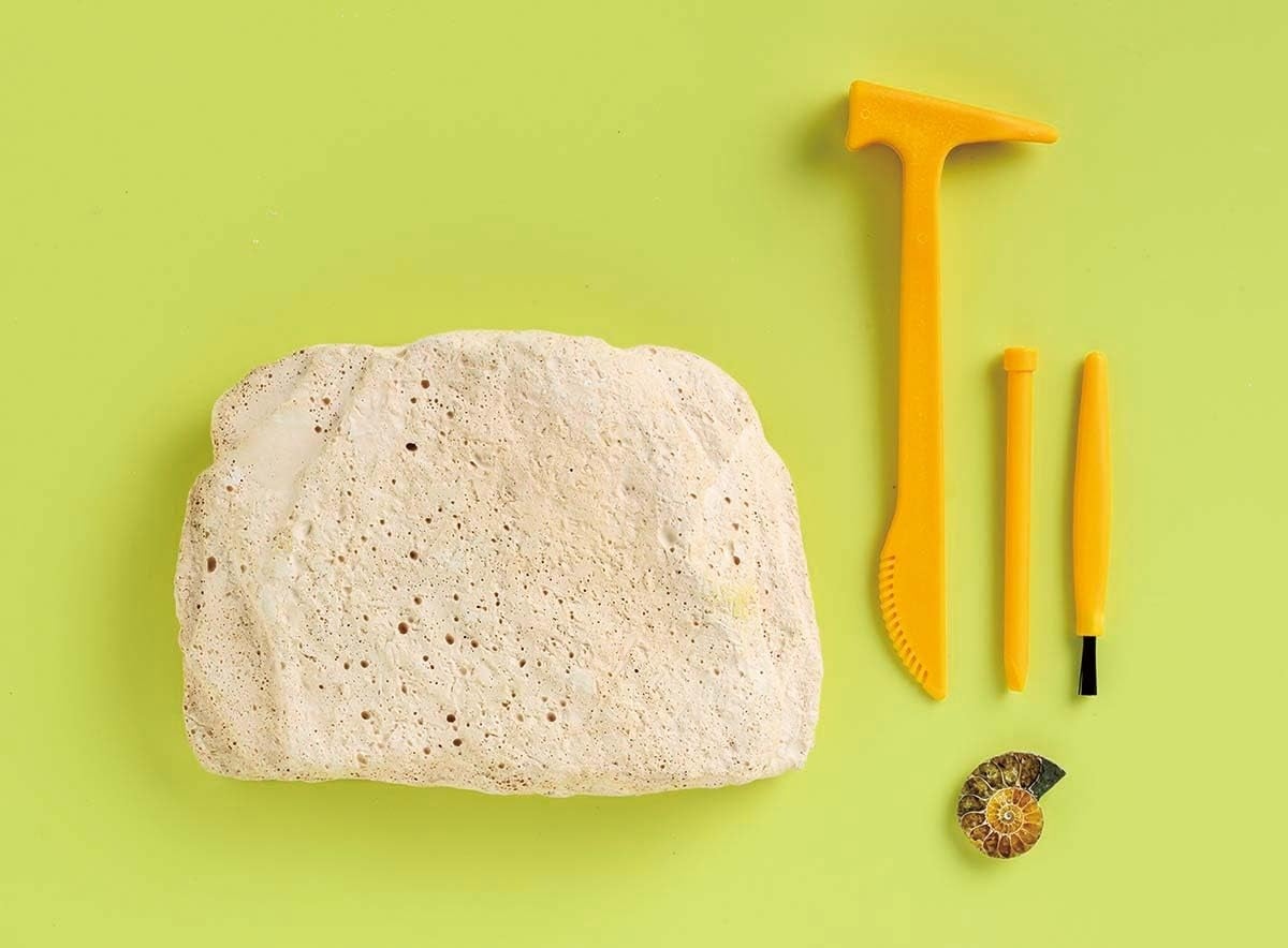 国立科学博物館に展示されているトリケラトプスの化石「レイモンド」の発掘体験ができるキット。アンモナイトのほんもの化石つき。