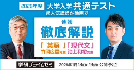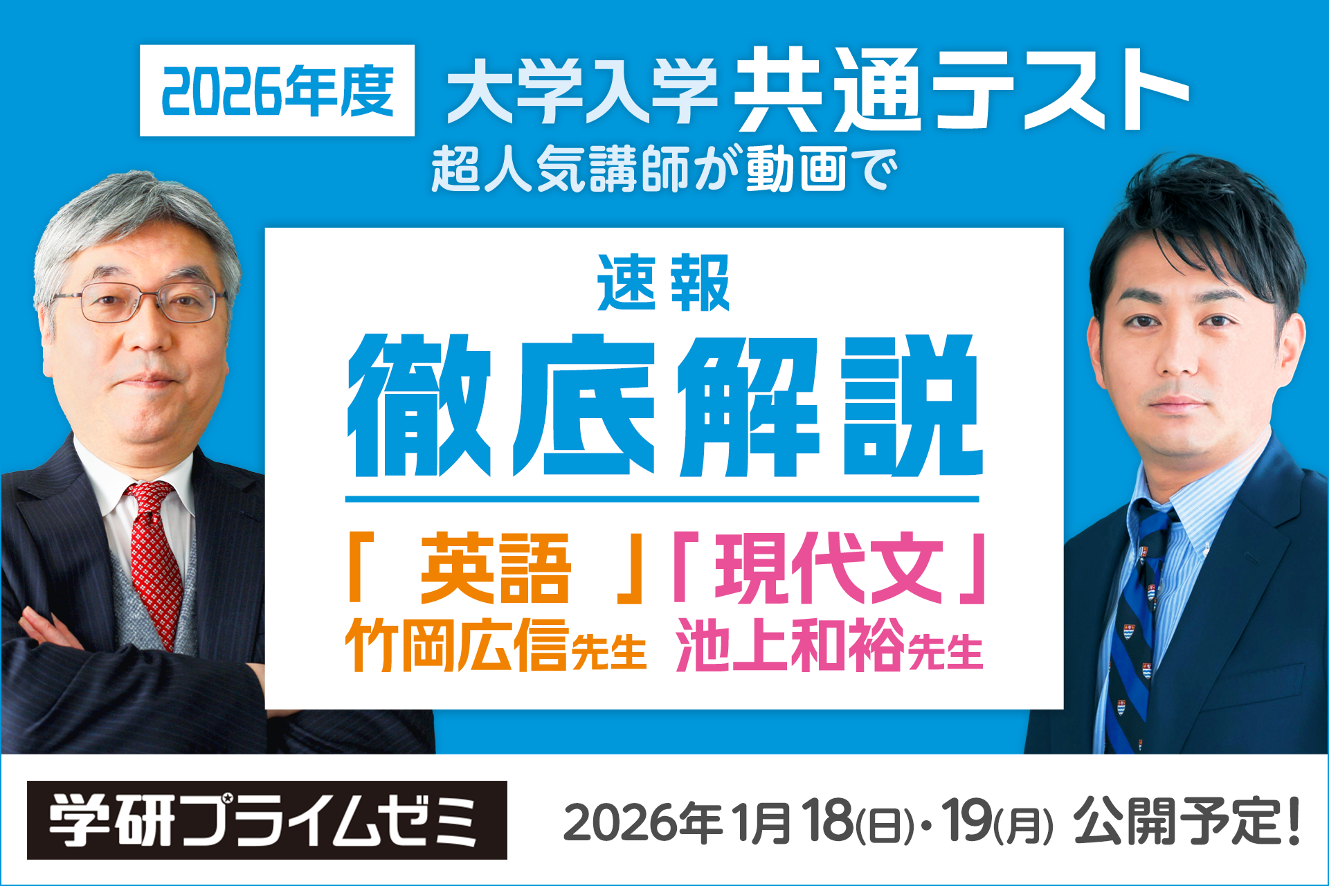 来る1月17・18日に実施される、共通テスト(令和8年度大学入学共通テスト)。「学研プライムゼミ」では、竹岡広信先生が「英語」を、池上和裕先生が「現代文」を解説した動画を速報にて無料公開します。