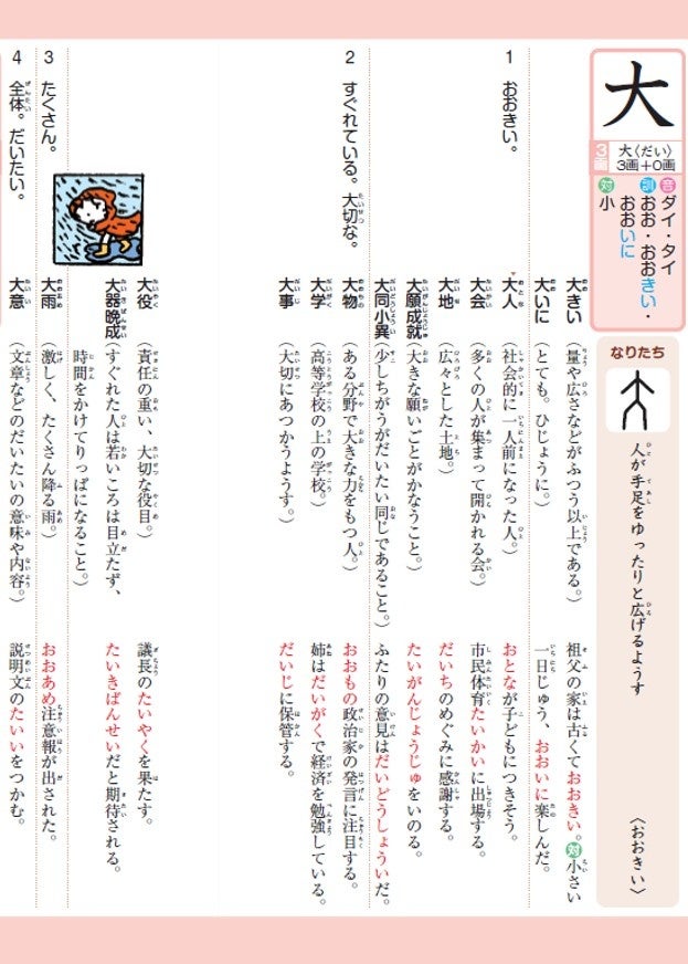 本書の特長として、意味ごとに熟語を示し、さらに熟語の意味と用例も載せています。例えば「大」という漢字では、1の意味「おおきい」のところに「大地」という熟語と、その意味と用例をのせています。2の意味「すぐれている」のところに「大物」「大事」を、3の意味「たくさん」のところに「大雨」を、4の意味「全体」のところに「大意」をそれぞれ載せています。