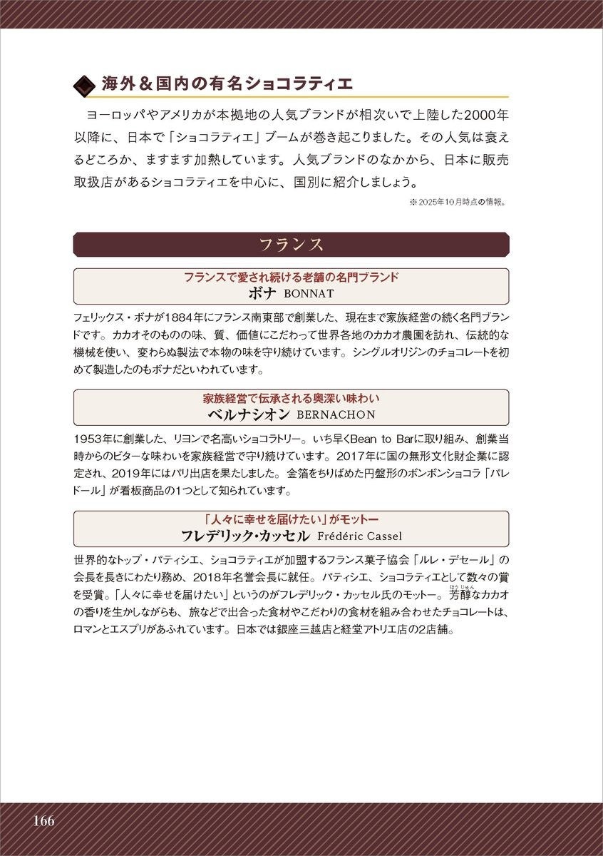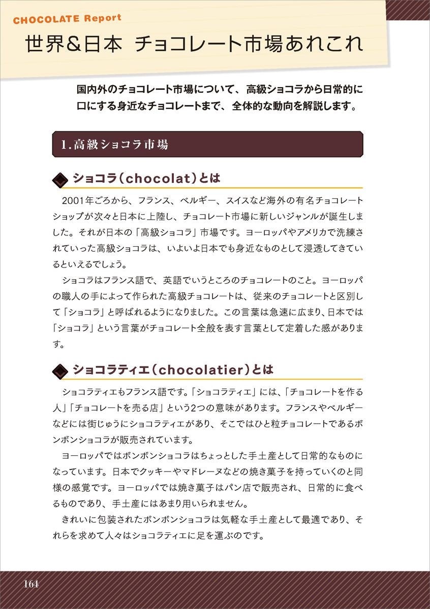 カカオの生態からチョコレートの製造法、豆知識まで幅広く学べるうえ、カカオ豆生産地の特徴や日本でたのしめるBean to Barブランド、国内外の有名ショコラティエなどの最新情報も掲載