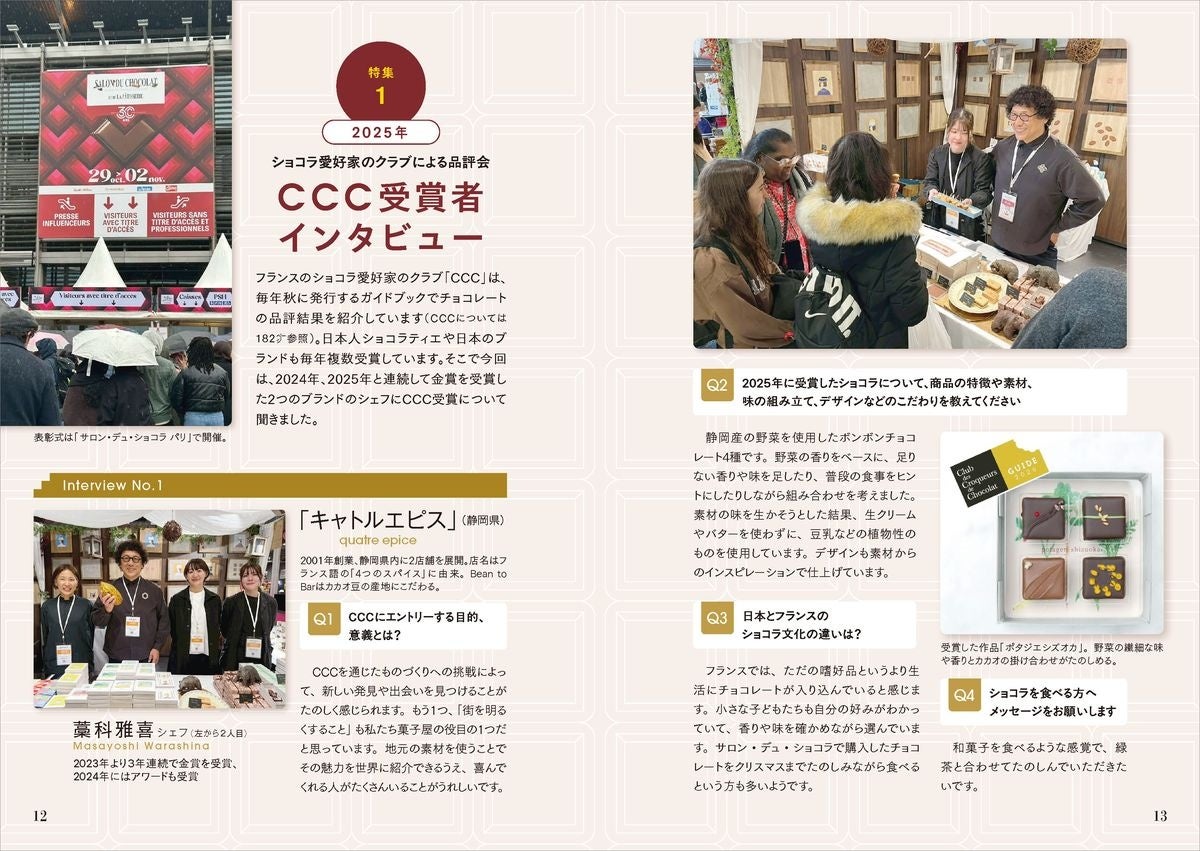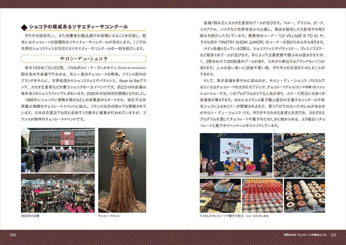巻頭では、フランスのショコラ愛好家のクラブ「CCC」による品評会で金賞を受賞した「キャトルエピス」「プレスキルショコラトリー」のインタビュー記事と、カカオ・チョコレート業界のSDGs関連レポートを特集。チョコレート好きなら見逃せない、日本でたのしめるBean to Barブランド、カカオ産地とのつながりが深いブランド、主なクーベルチュールメーカーおよびブランド、海外&国内の有名ショコラティエの情報もアップデートして解説。さらに、国別カカオ豆生産量や、ショコラの権威あるソサエティー、コンクールなど、チョコレートにまつわる最新情報が満載です。