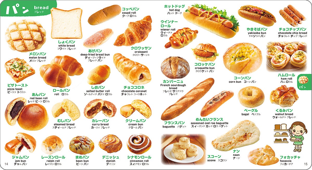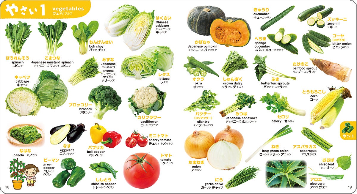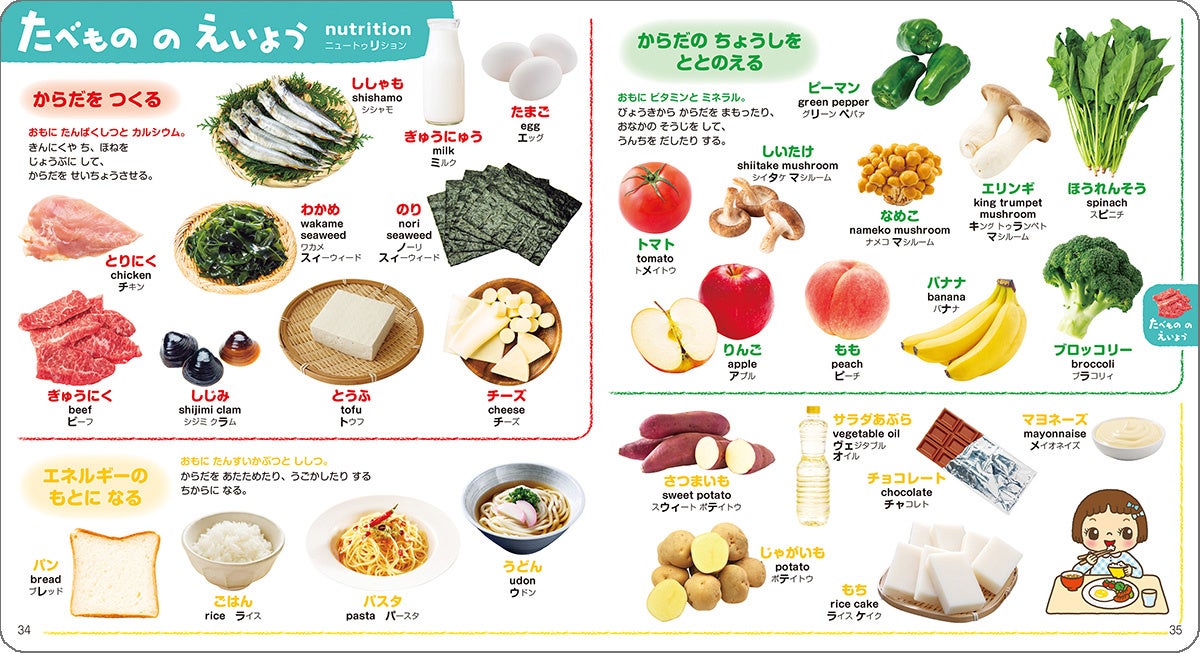 それぞれの言葉には、英語と発音のカナ付き。“tomato”、“grape”、“rice”など、最初に覚えたい英単語もたっぷりだから、英語教育の導入にもぴったり。お子さんに身近な食べ物を通して、発語を促すのと同時に、英語脳も育みましょう。