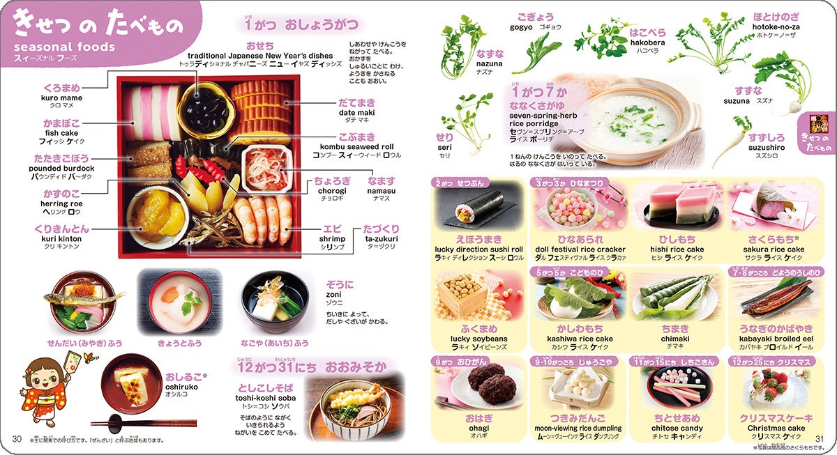 季節の食べものや各地の郷土料理など、一歩進んだ知識も掲載。食べ物を通して、行事の感覚や都道府県の名前も知ろう!