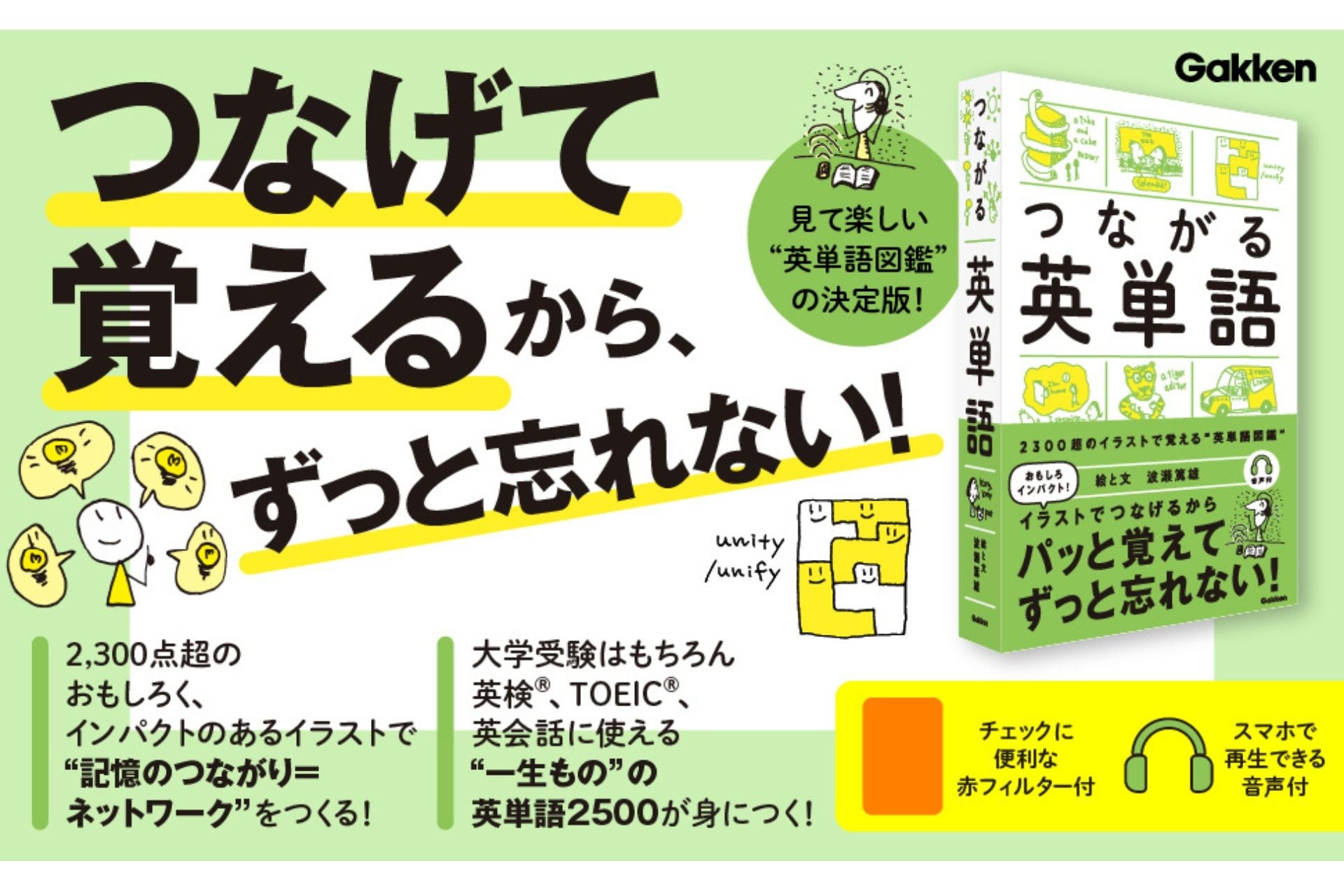 本書ではイラストで楽しみながら学べるだけでなく、発音、派生語、用例といった単語帳に不可欠な要素を網羅しました。赤フィルターを活用した反復学習も、音声アプリを使ったスキマ時間の学習も、これ一冊で完結します。掲載している用例は、使い勝手の良さを追求したコンパクトなフレーズ。ネイティブの視点を取り入れた生きた表現に触れることができます。使える一生ものの英単語を学びたいすべての人に手に取っていただきたい一冊です。