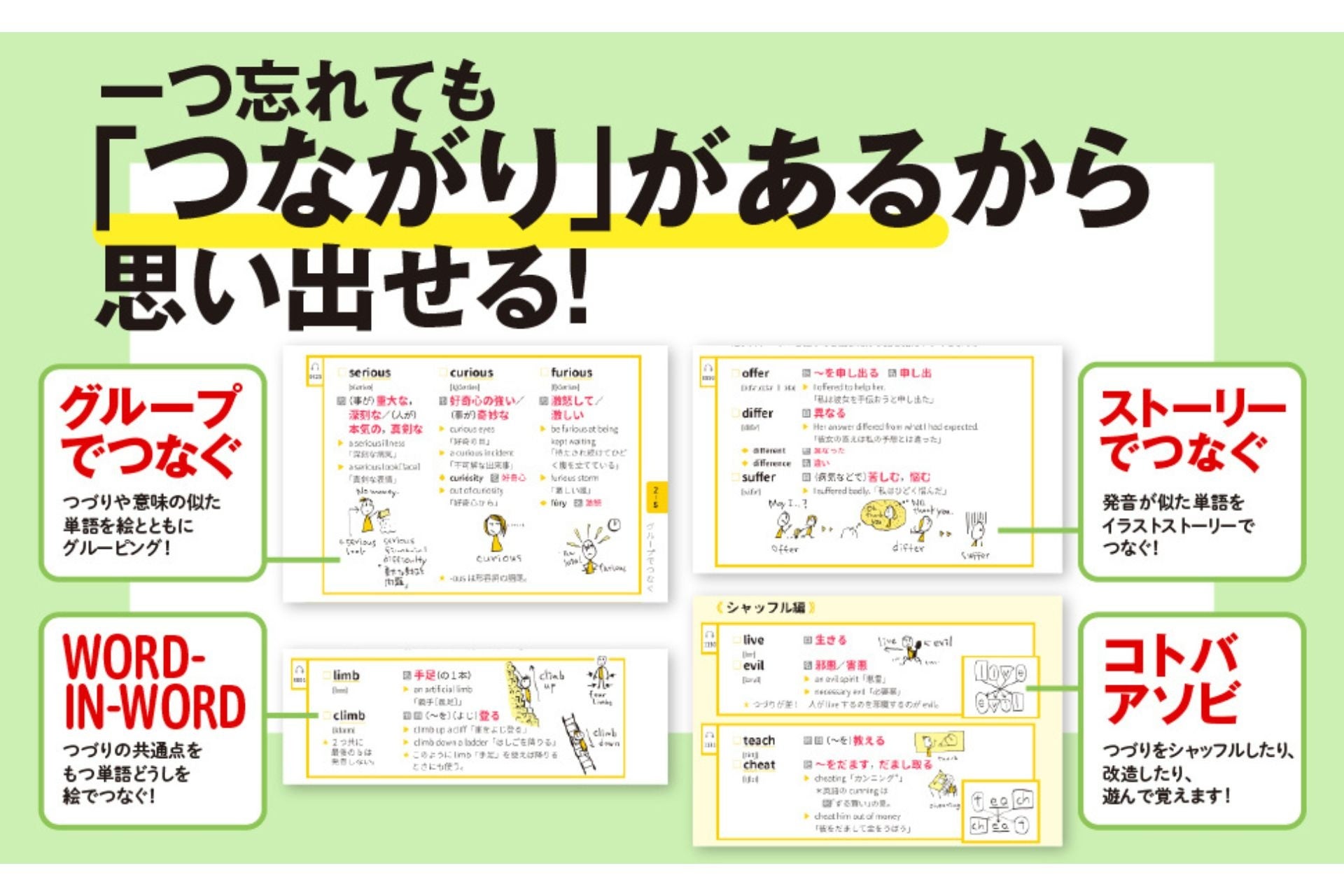 語源、似ているつづり(1字違い)、音の共通性、コトバアソビ、ゴロ合わせなど、十数年の指導経験で培った「学習者が最も覚えやすいルート」を網羅。理屈とイメージの両面からアプローチします。
