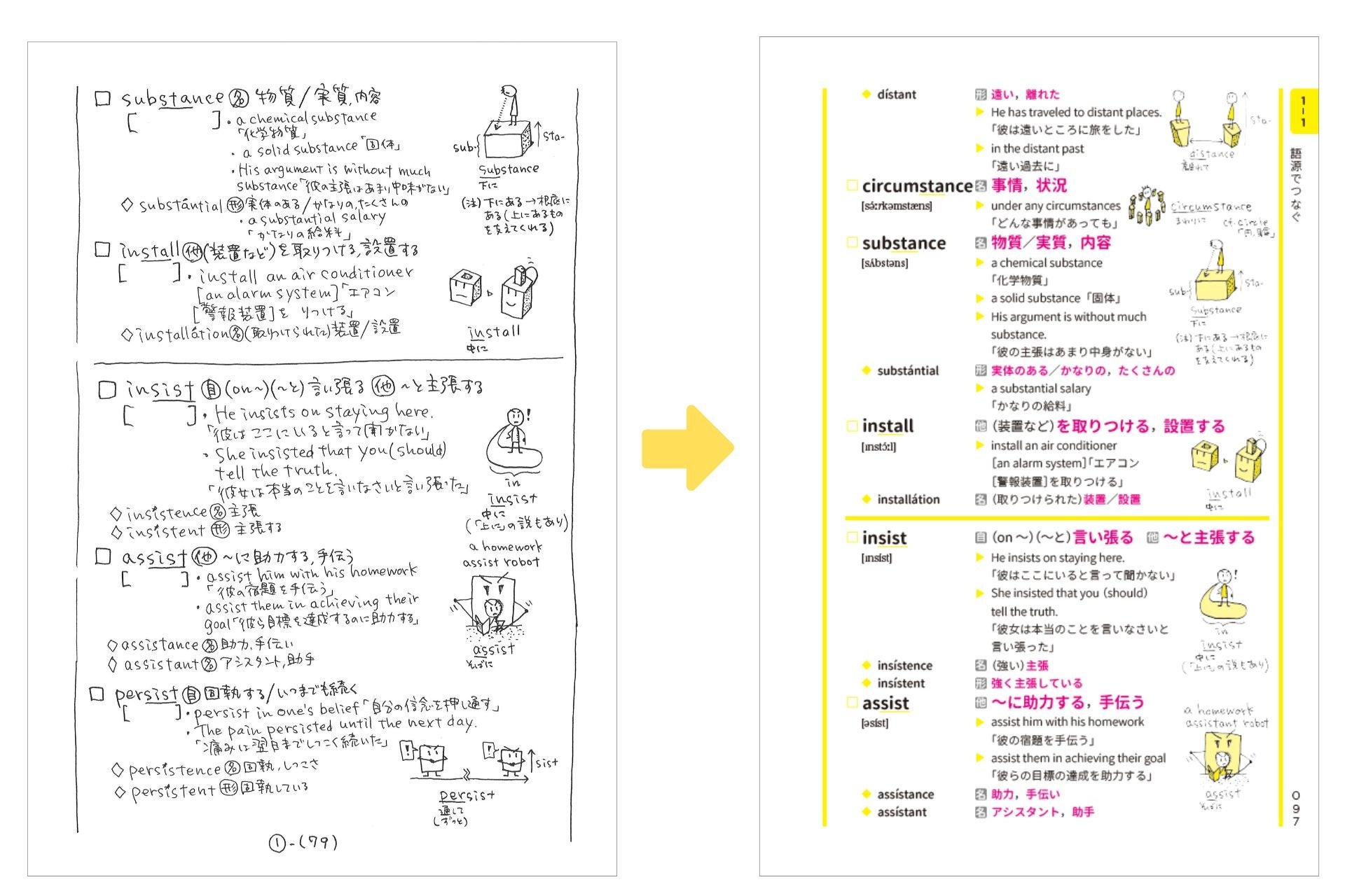 基本の棒人間に加え、宇宙人やロボットなど個性豊かなキャラクターが次々に登場。図鑑のようにパラパラめくるだけで単語が強烈に印象づけられ、記憶に焼き付きます。また覚えやすさは人それぞれ。本書では、同じ単語が異なる「つながり」の切り口で何度も登場します。読者が自分にとって一番しっくりくる方法を選んで、着実に語彙力を伸ばせます。
