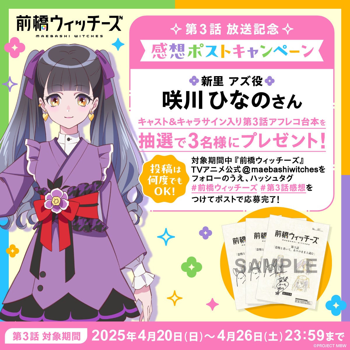 オリジナルアニメ『前橋ウィッチーズ』の放送を記念して、新里アズ役 咲川ひなのさんのキャスト&キャラサイン入り第3話台本を、3名様にプレゼントいたします。