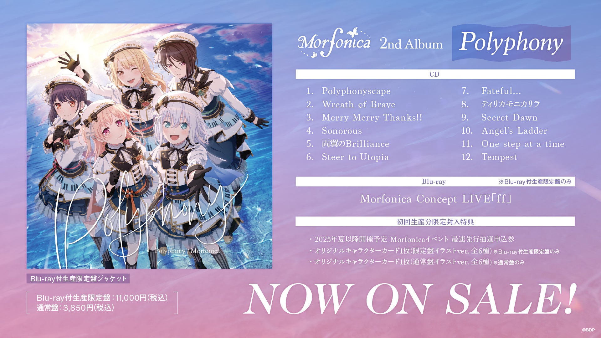 Morfonica 2枚目のFull Album「Polyphony」が好評発売中です。書き下ろし新曲「Polyphonyscape」を含む12曲を収録。Blu-ray付生産限定盤には、昨年10月に河口湖ステラシアターにて開催されたMorfonica Concept LIVE「ff」のライブ映像を収録しています。