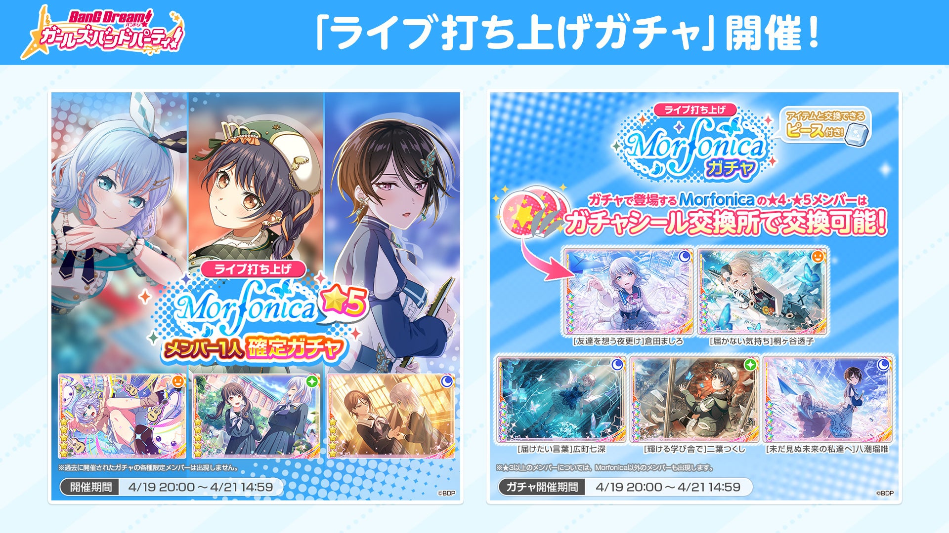 本ライブ開催を記念して、「ライブ打ち上げガチャ」が開催中です。Morfonicaメンバーの出現率がアップするほか、様々なアイテムと交換できるピース付きとなります。