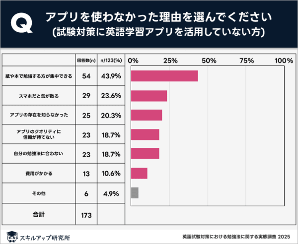 試験対策に英語学習アプリを活用していない人を対象に、「アプリを使わなかった理由を選んでください。」との質問を行うと、「紙の方が集中できる(43.9%)」や「スマホだと気が散る(23.6%)」といった、学習環境の質を重視する回答が上位を占めた。