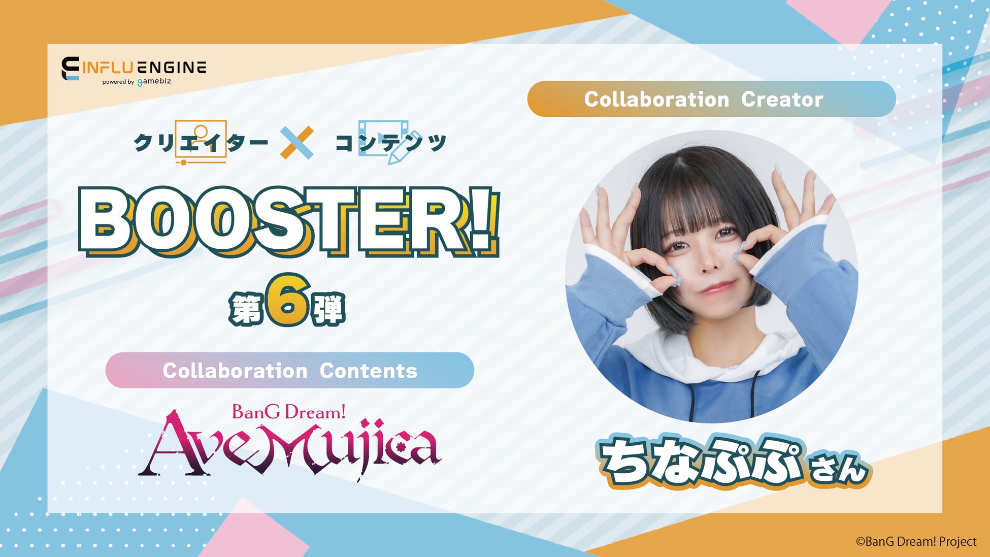 株式会社ブシロード (本社:東京都中野区、代表取締役社長:木谷高明)のグループ会社にあたる株式会社ゲームビズ(本社:東京都中野区、代表取締役社長:大貫佑介)は、インフルエンサーコラボレーションサービス「INFLU ENGINE(インフルエンジン)」で開催中のコラボ企画「クリエイター×コンテンツBOOSTER!!」にて人気インフルエンサー「ちなぷぷ」とコラボいたしました。報道関係の皆様におかれましては、ぜひ本情報をお取り扱いいただきますよう、お願い申し上げます。