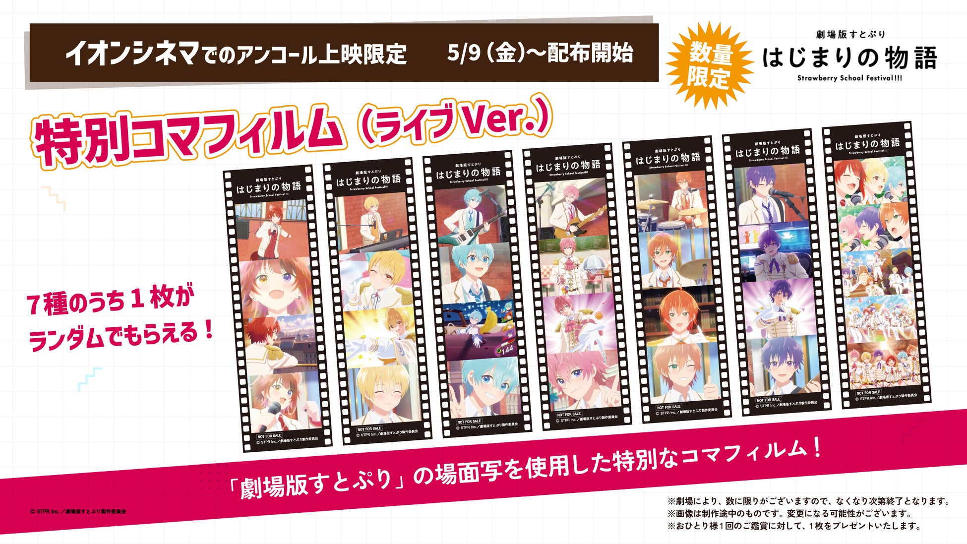 2024年10月にTOKYO DOME CITY HALLで開催された「劇場版すとぷり 特別応援上映会!~莉犬&るぅと スペシャルミニライブ~」のミニライブ映像が本編終了後に特別上映されます。そしてアンコール上映限定の入場者プレゼント「特別コマフィルム」がついてきます!あの感動をもう一度映画館で堪能してください!