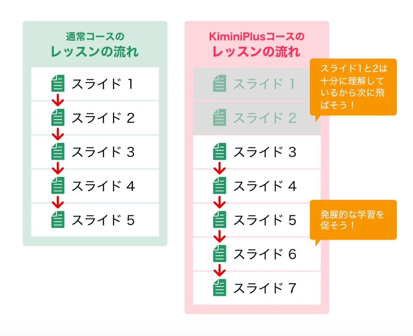 Kimini Plusコースは、AIが学習者一人ひとりの学習状況を分析。学習者の習熟度に合わせてレッスン時に表示されるレッスンスライドが変わるので、苦手な単元は基礎からしっかり学習を行い、得意な単元は難易度の高いレッスンスライドからレッスンを始めることができます。