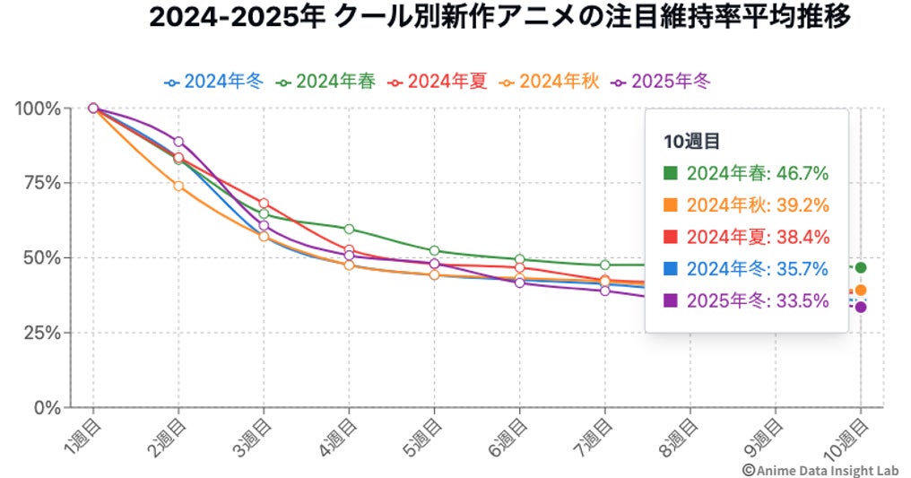 一方で、多くの作品は6週目以降に視聴者の関心を急速に失っており、初動での話題性がそのまま長期的な成功につながるとは限らないことが示されています。全体としての維持率が10週目で33.5%と過去1年間の中で最も低い水準になっていることからも、視聴者の選別がより厳しくなっていることがうかがえます。