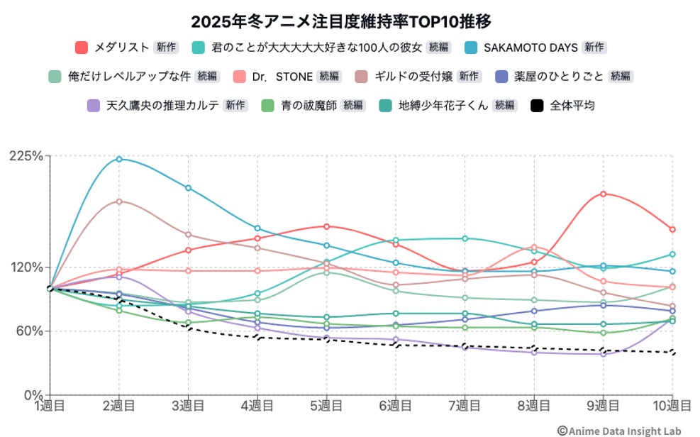 トップ5作品のうち、3作品(『メダリスト』『100カノ』『SAKAMOTO DAYS』)が10週目時点で1週目を上回る注目度を維持している。これは稀なケースであり、これらの作品が視聴者から特に高い評価を得ていることを示しています。