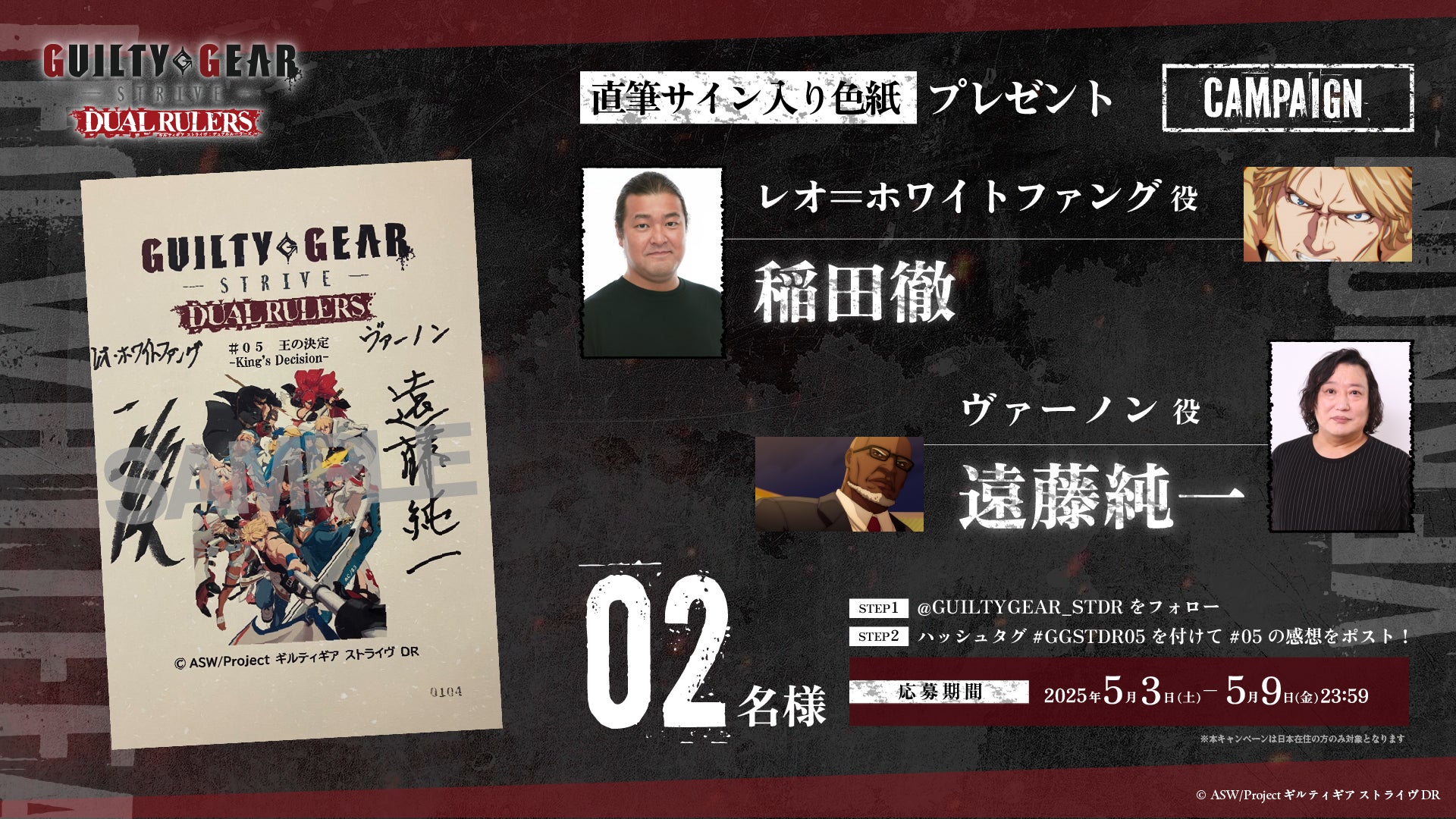 TVアニメ『GUILTY GEAR STRIVE: DUAL RULERS』#05放送を記念して、レオ=ホワイトファング役 稲田徹さんとヴァーノン役 遠藤純一さんのサイン入り#05台本を、2名様にプレゼントいたします。