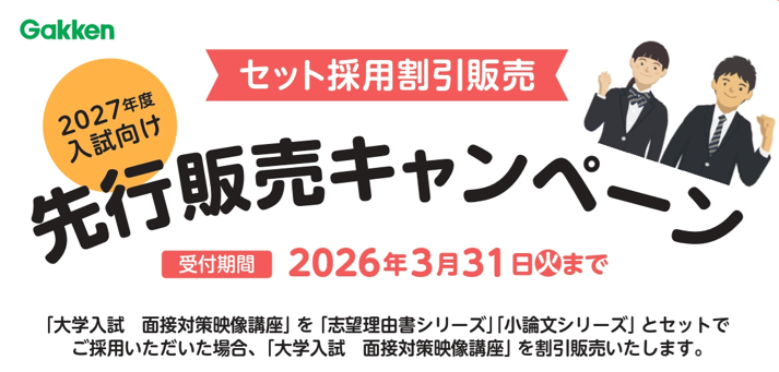 「大学入試面接対策映像講座」とGakkenが販売する添削教材「志望理由書シリーズ」や「小論文シリーズ」をセットで採用していただいた場合、「大学入試面接対策映像講座」を割引販売するキャンペーンを実施中です。受付は2026年3月31日(火)まで。