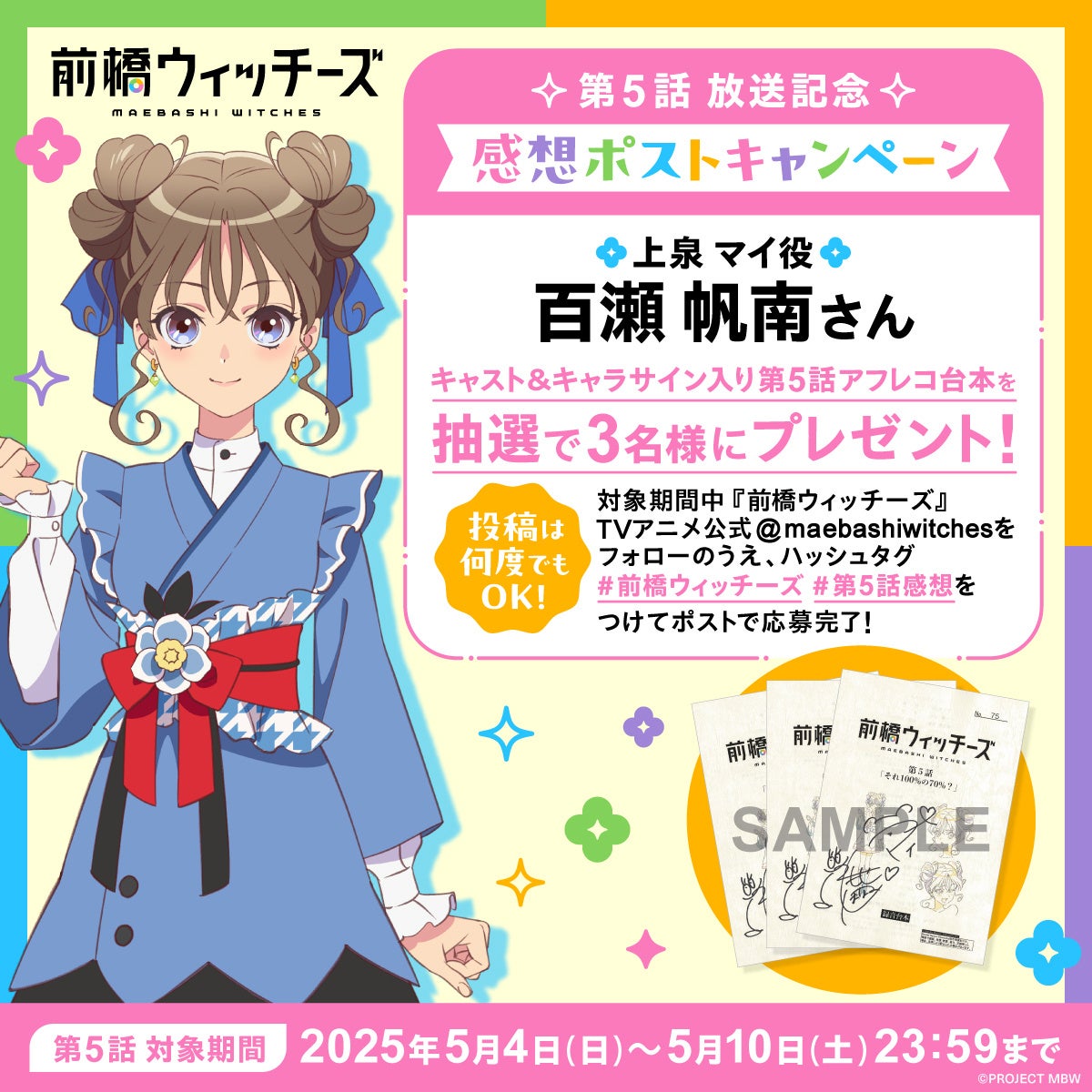 オリジナルアニメ『前橋ウィッチーズ』の放送を記念して、上泉 マイ役 百瀬 帆南さんのキャスト&キャラサイン入り第5話台本を、3名様にプレゼントいたします。