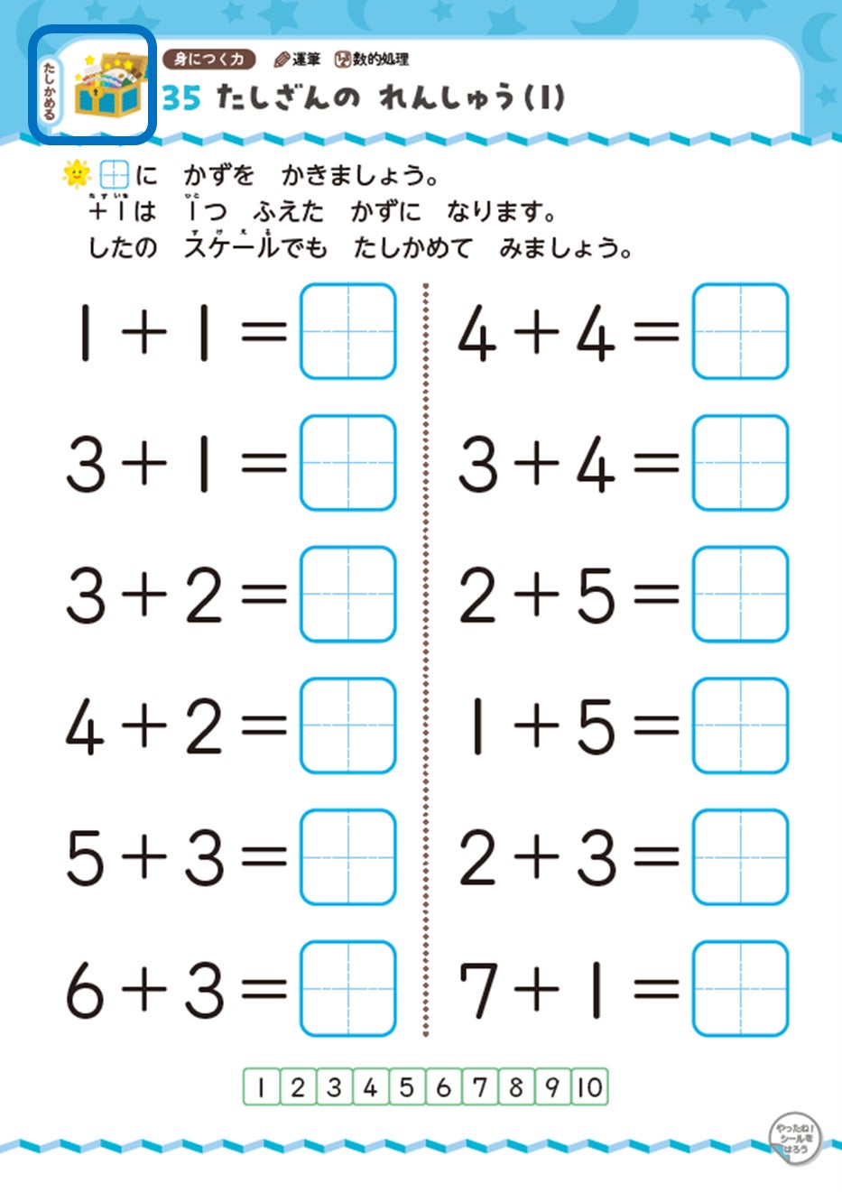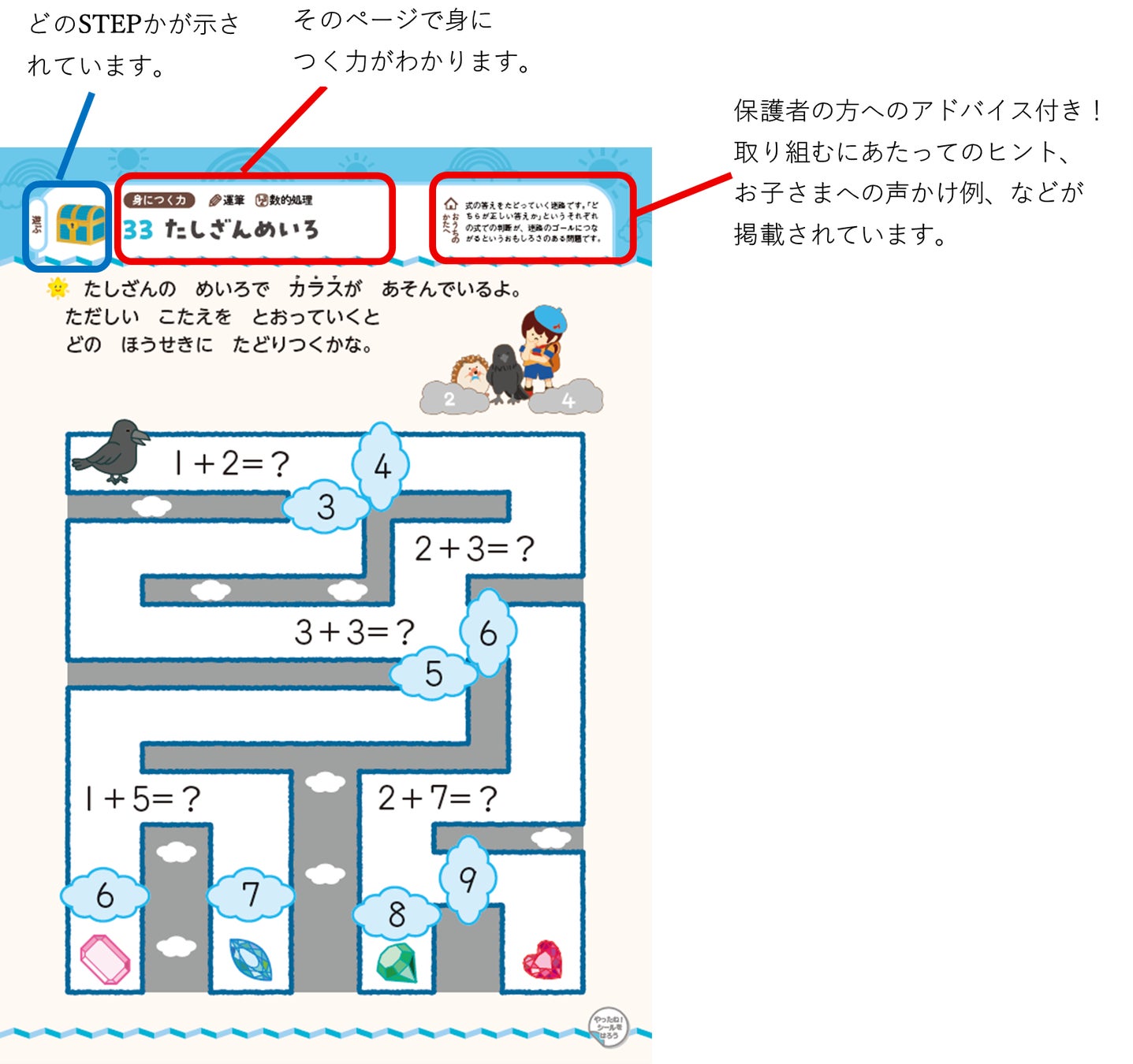 キャラクターといっしょに「動物の世界」を冒険しながら、「数」の概念とたし算の基礎が自然と身につくように構成されたドリルです。