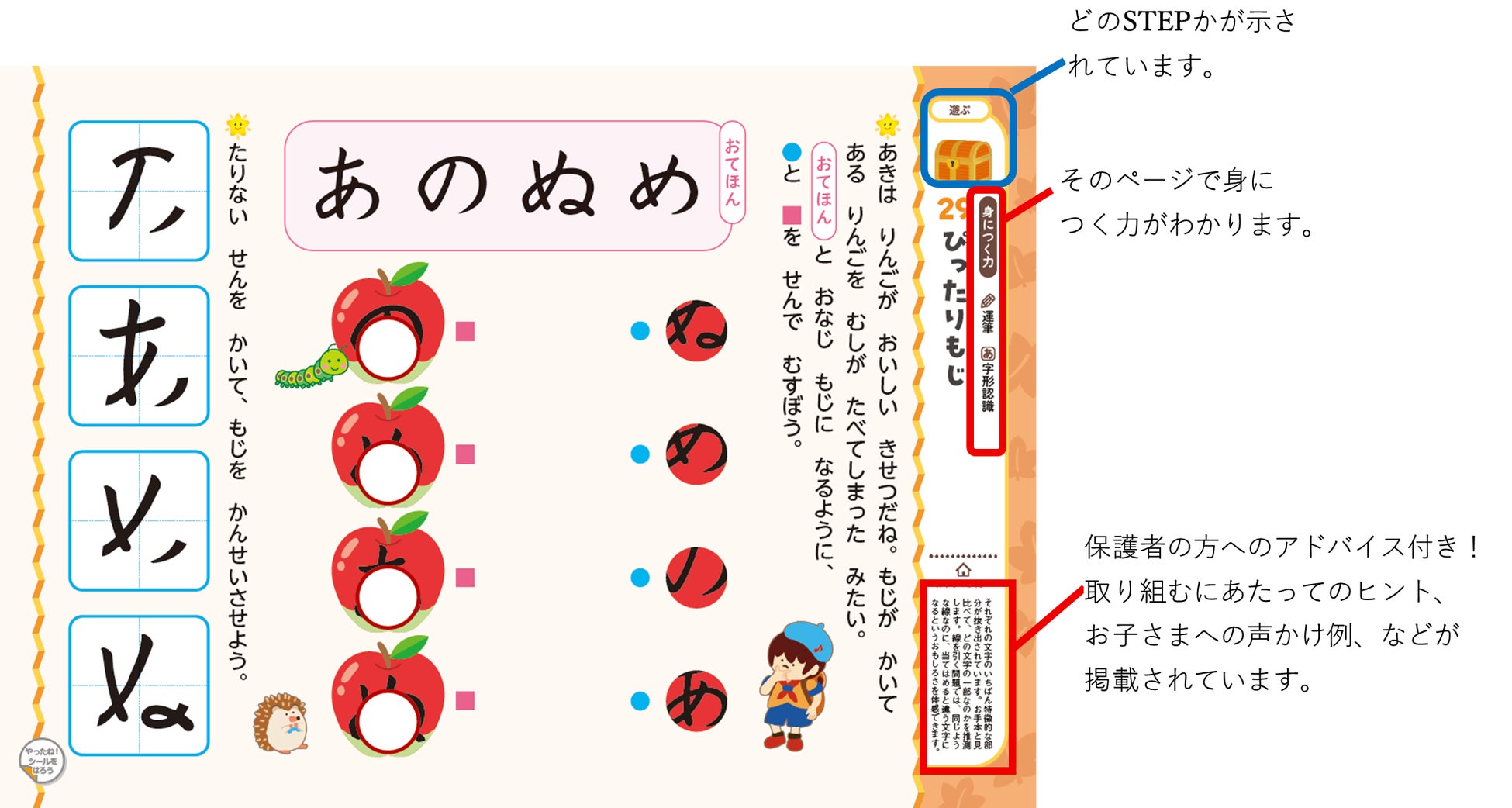 キャラクターといっしょに「季節の世界」を冒険しながら、ひらがなが自然と身につくように構成されたドリルです。