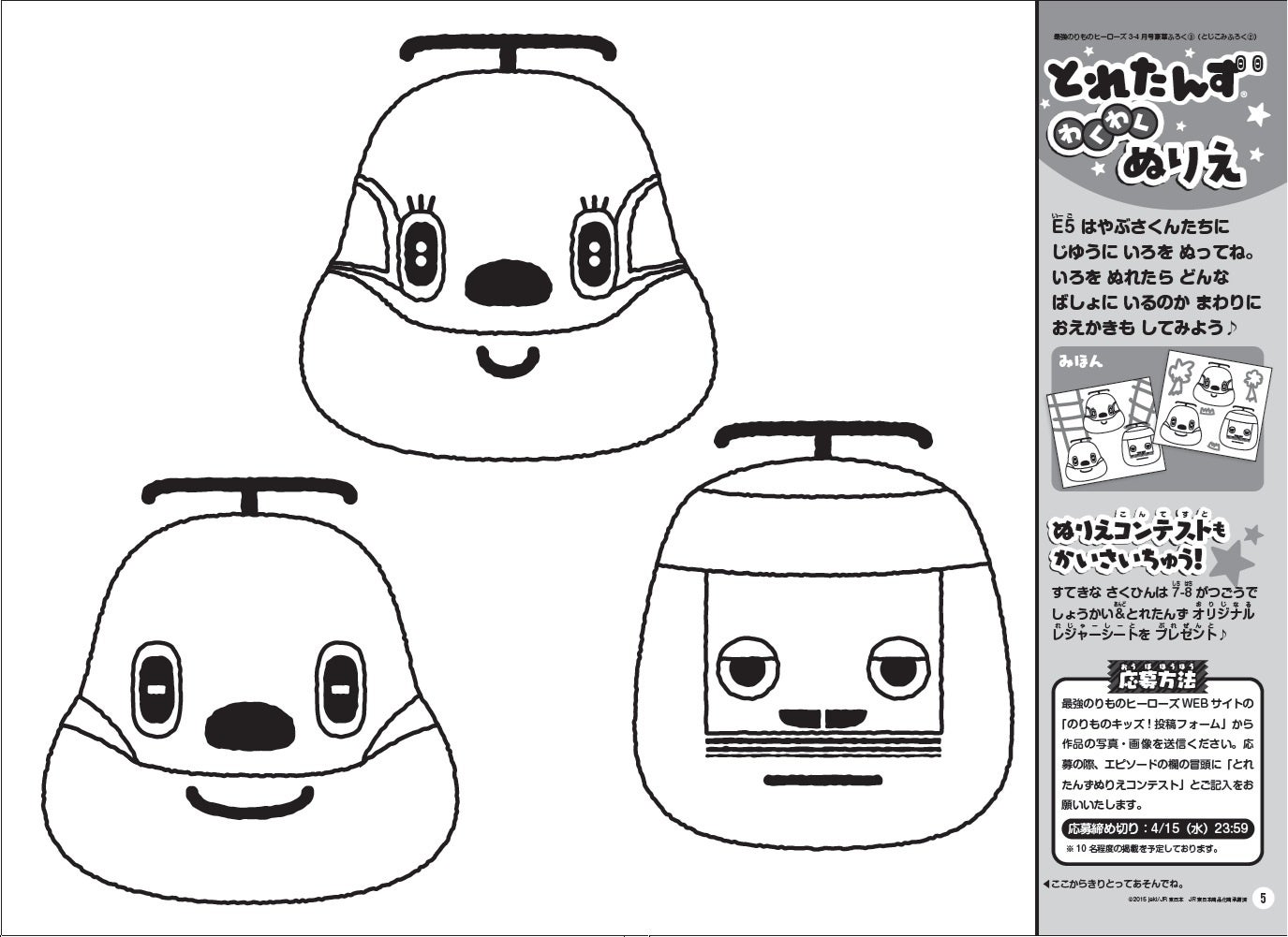 とれたんずの「E5 はやぶさくん」「E6 こまちちゃん」「Dr.イーストアイ」のぬりえ。ぬりえコンテストも開催中です。