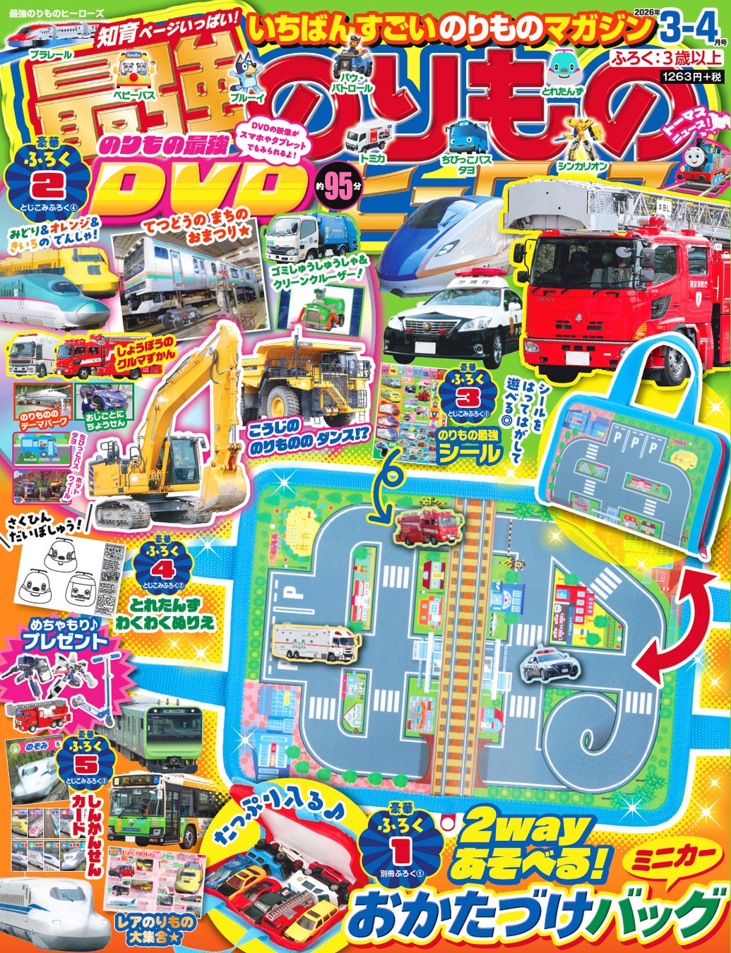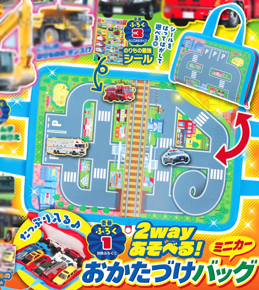 2wayであそべる! ミニカーおかたづけバッグ、約95分ののりもの最強DVD、とれたんずわくわくぬりえ、新幹線カードなど、最新号ものりもの超いっぱい