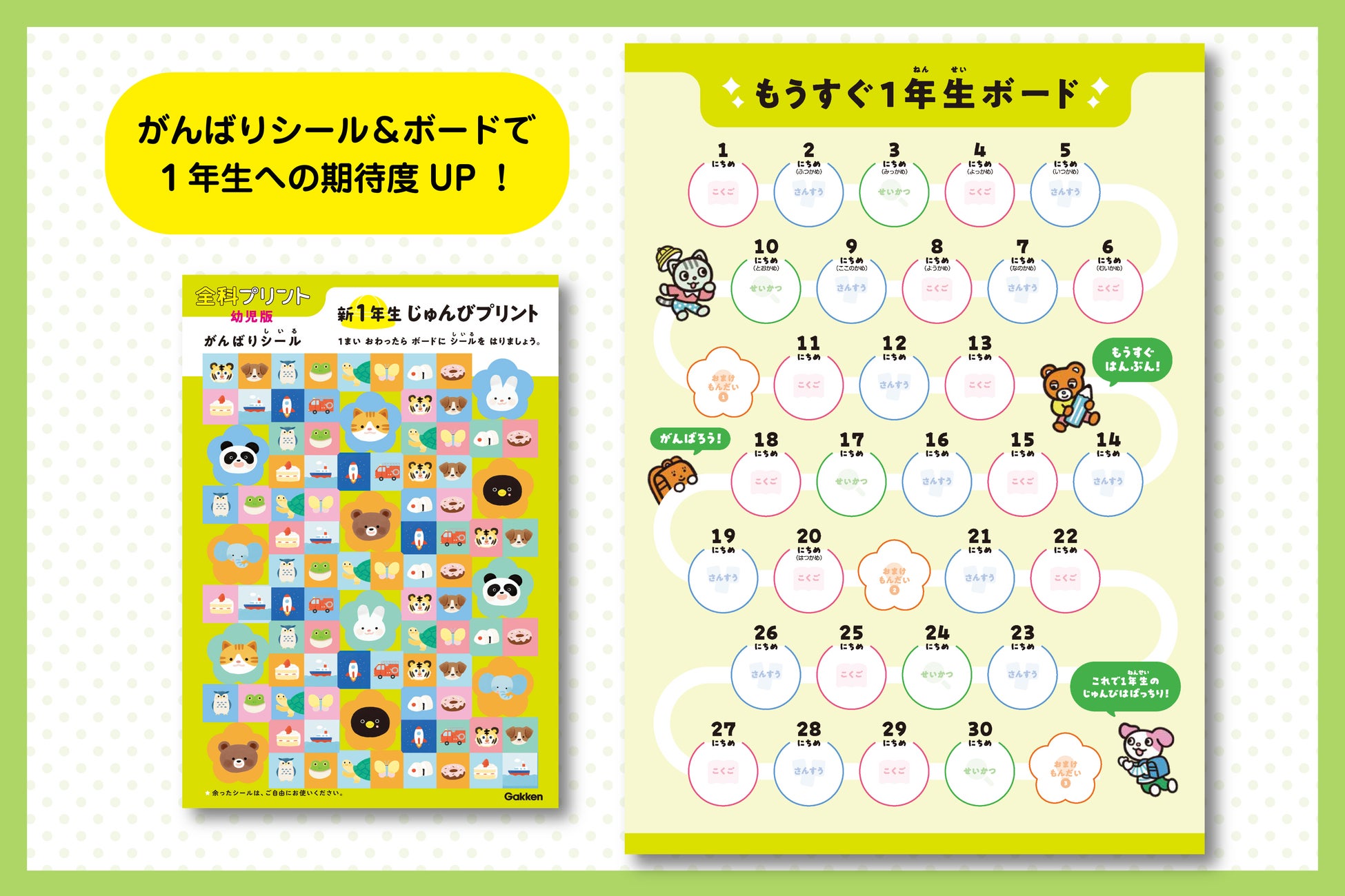 プリントが終わるたびにシールをボードに貼っていきます。全てのシールを貼り終えると「1年生」への準備はばっちり! お子さんのモチベーションを最後まで維持します。