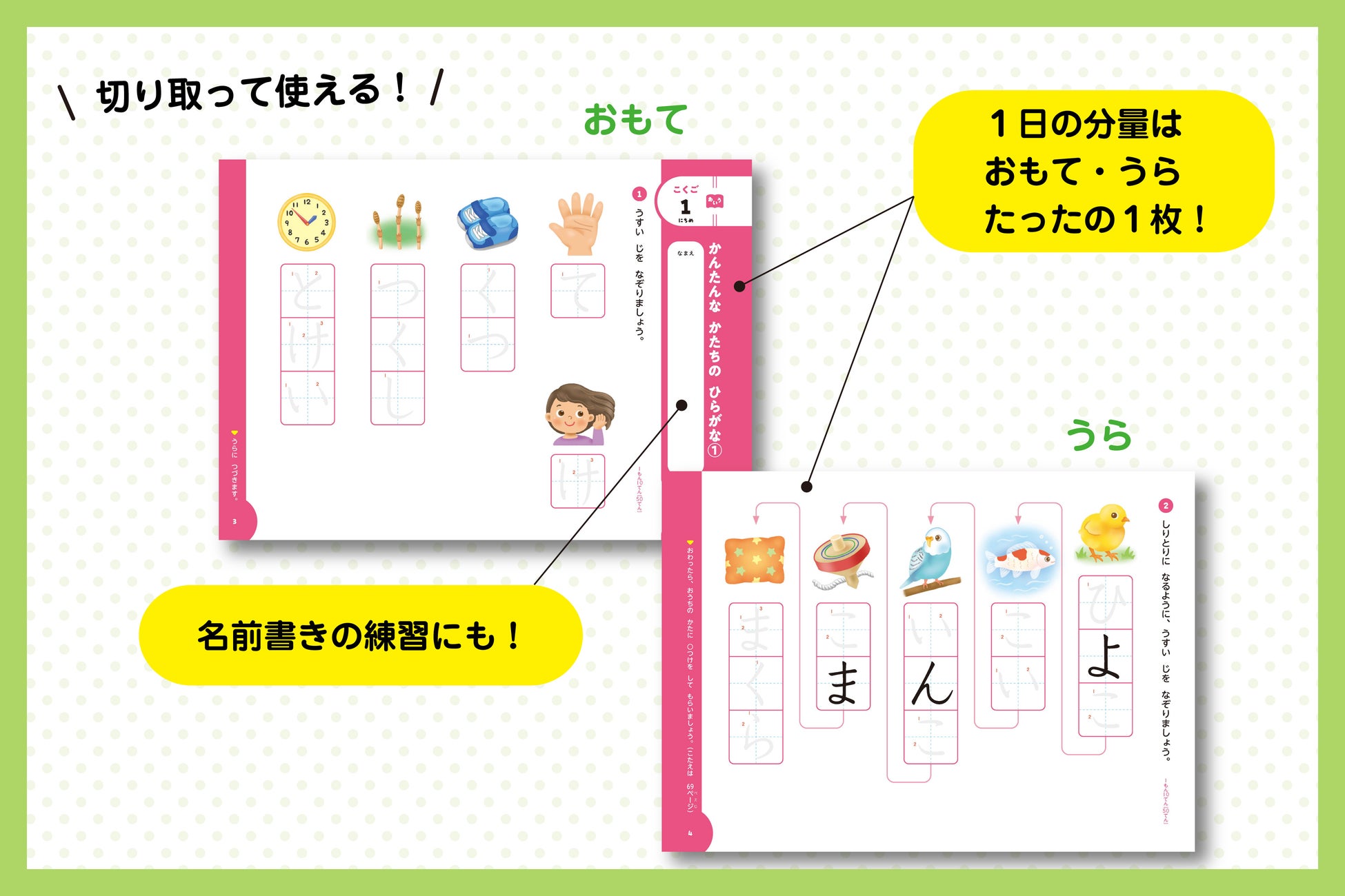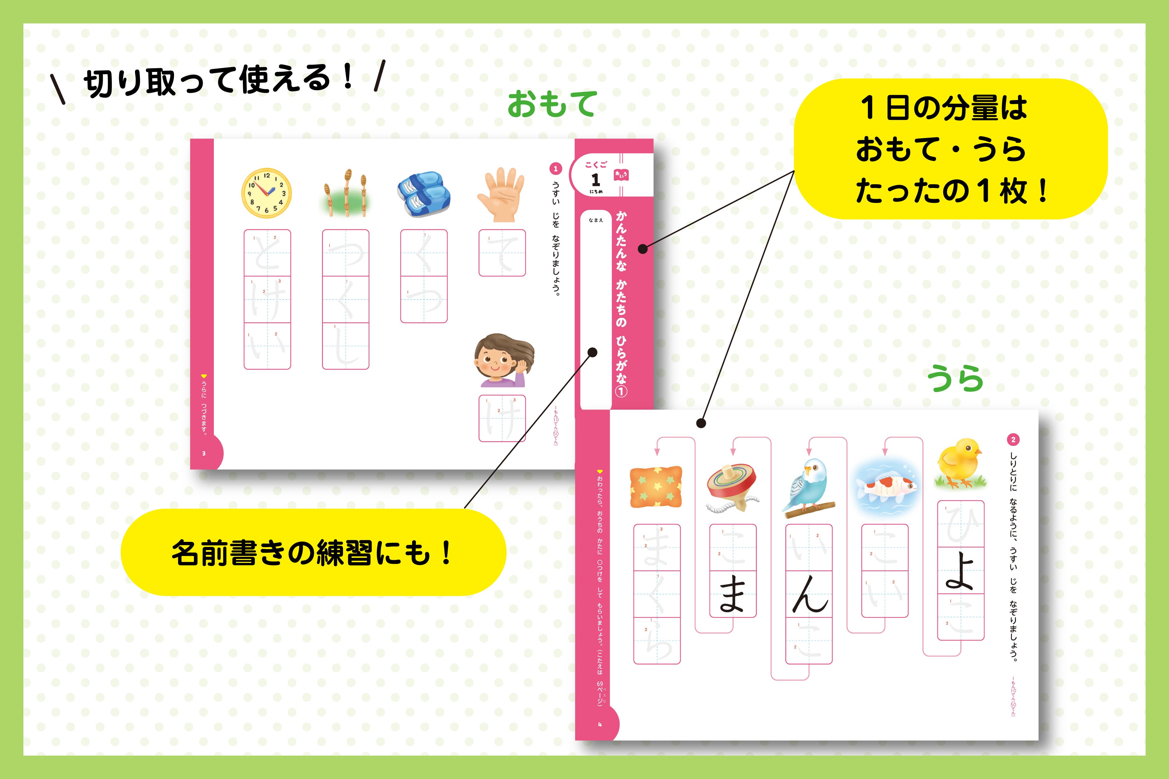 1日1枚ペリッとはがしてお子さんに渡すだけでOK。これまでの幼児ワークの「楽しさ」はそのままに、小学校のテストに近い「配点・採点」の要素をプラスしました。小学校入学後の学習をスムーズにスタートさせるためにぴったりな1冊です。