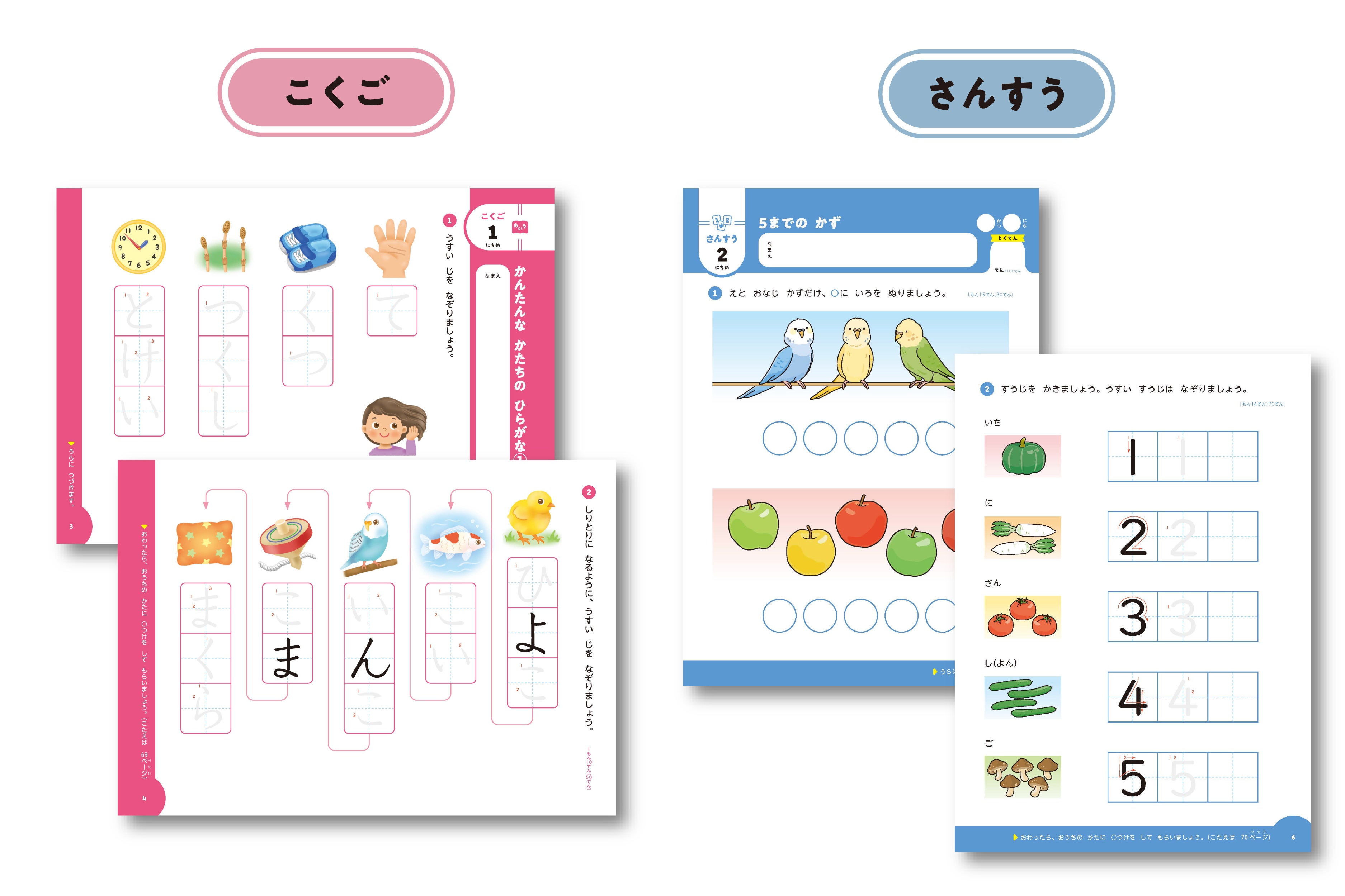 ▶さんすう:「5までのかず」から「ひきざんの導入」まで。カラーイラストで取り組みやすく、基礎をしっかり固めます。