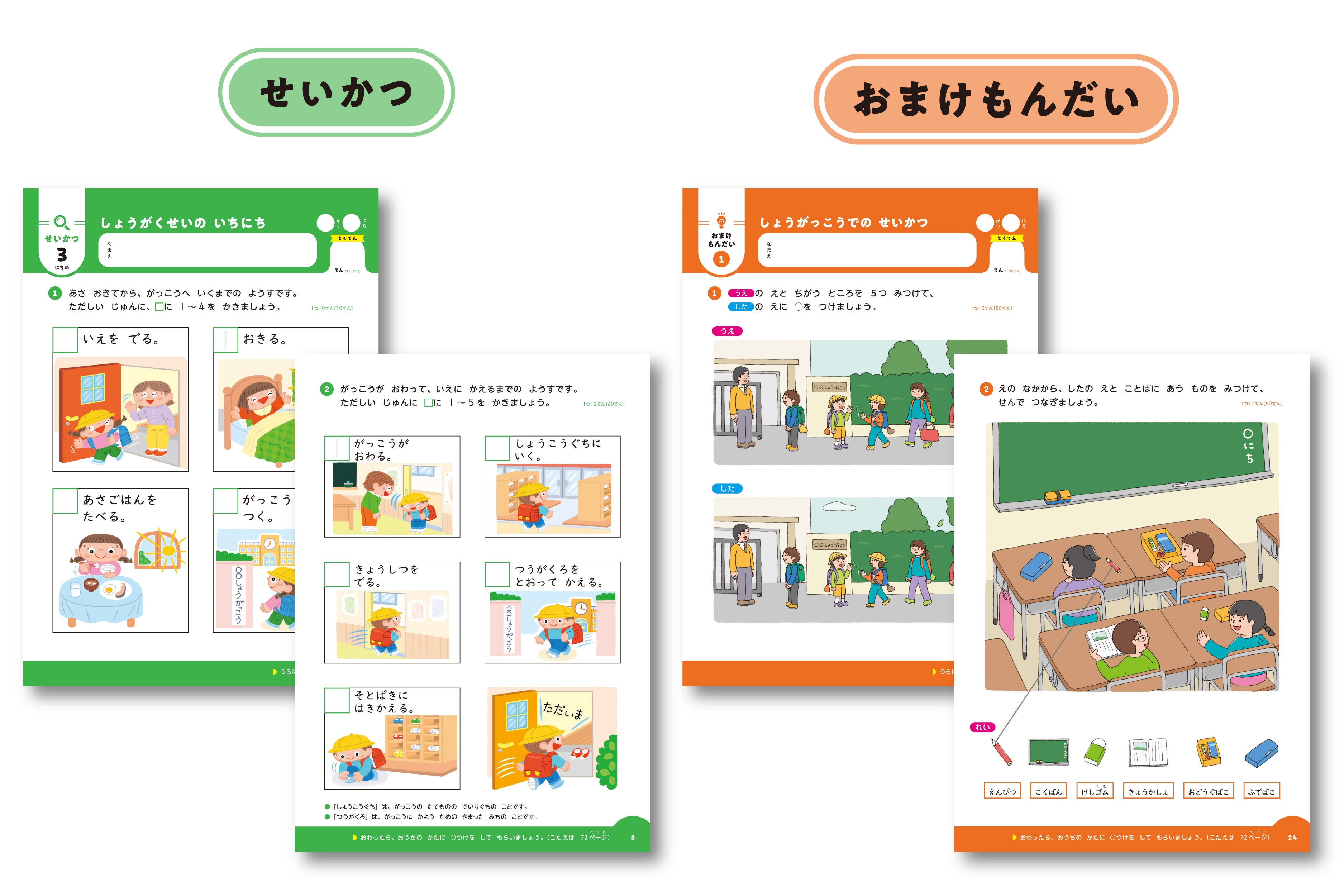 ▶せいかつ:学校生活の流れや「せいかつ」の授業で学ぶ内容をイメージできる問題を掲載。