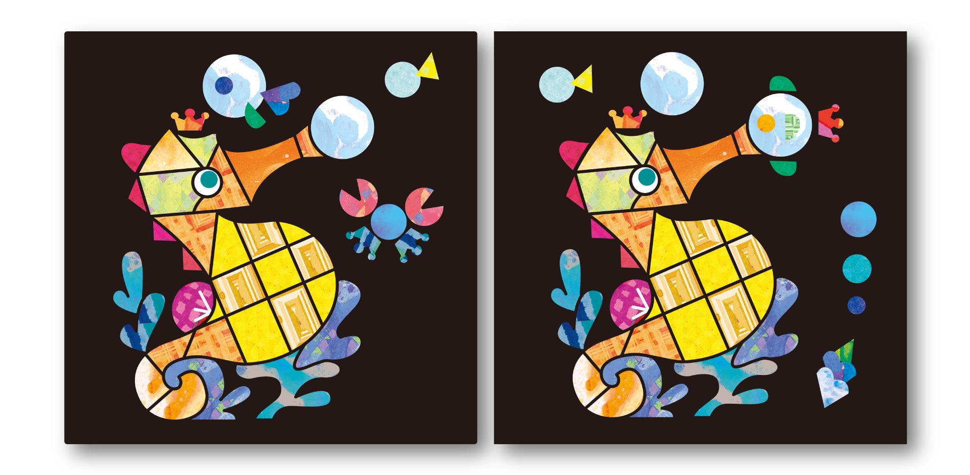 本書には、貼る場所が決まっていない「かざりシール」のついた作品も。好きなところに貼って、思い思いの作品に仕上げます。最後の作品では、パーツを組み合わせて、より自由に作品を創ることができます。