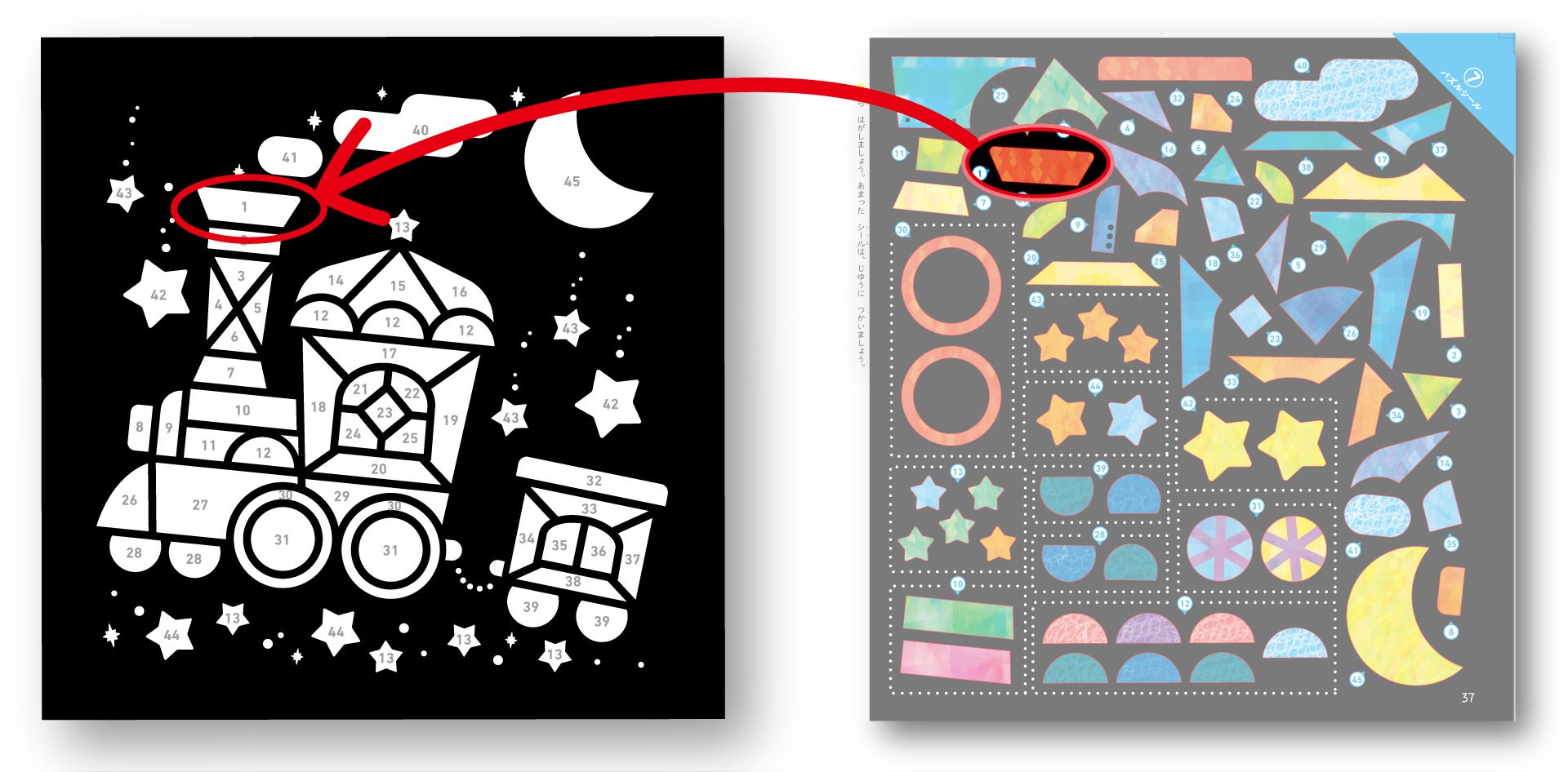 シール台紙にある数字と、同じ数字がふってあるシールを探して貼ります。
