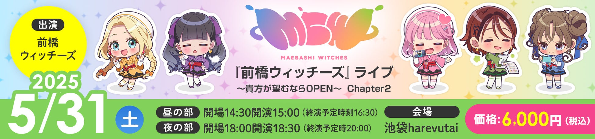 5月31日(土)に池袋harevutai にてTVアニメ「前橋ウィッチーズ」のライブイベント 「前橋ウィッチーズライブ ~貴方が望むならOPEN~ Chapter2」を開催します。ライブのために書き下ろされたオリジナルの朗読劇もあり、第4話・第5話のマイと優愛の物語を皆さんと振り返ります。ライブもあり、朗読もあり、追体験もあり!盛り沢山の内容となっておりますのでぜひご来場ください。
