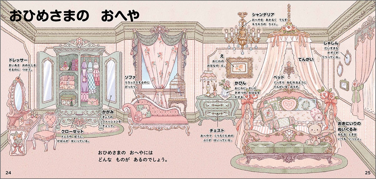 お姫様の華やかなお部屋やお城、お食事の紹介ページも。お姫様がどんな生活を送っているのか、想像が広がるページも満載です。
