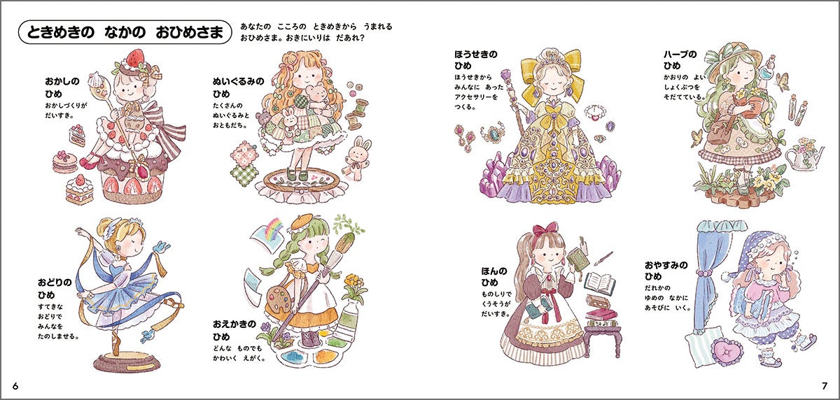自然や季節、ときめきやおとぎ話から生まれた、27人の個性豊かなお姫様が登場します! それぞれのお姫様から、キラキラした空想の世界が広がります。