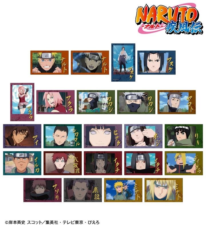 うずまきナルト、うちはサスケ、春野サクラ、はたけカカシ、ヤマト、サイ、奈良シカマル、日向ヒナタ、日向ネジ、ロック・リー、うみのイルカ、我愛羅、うちはイタチ、デイダラ、サソリ、飛段、波風ミナトの印象的なシーンをインスタントカメラ風のイラストシートに仕上げました。