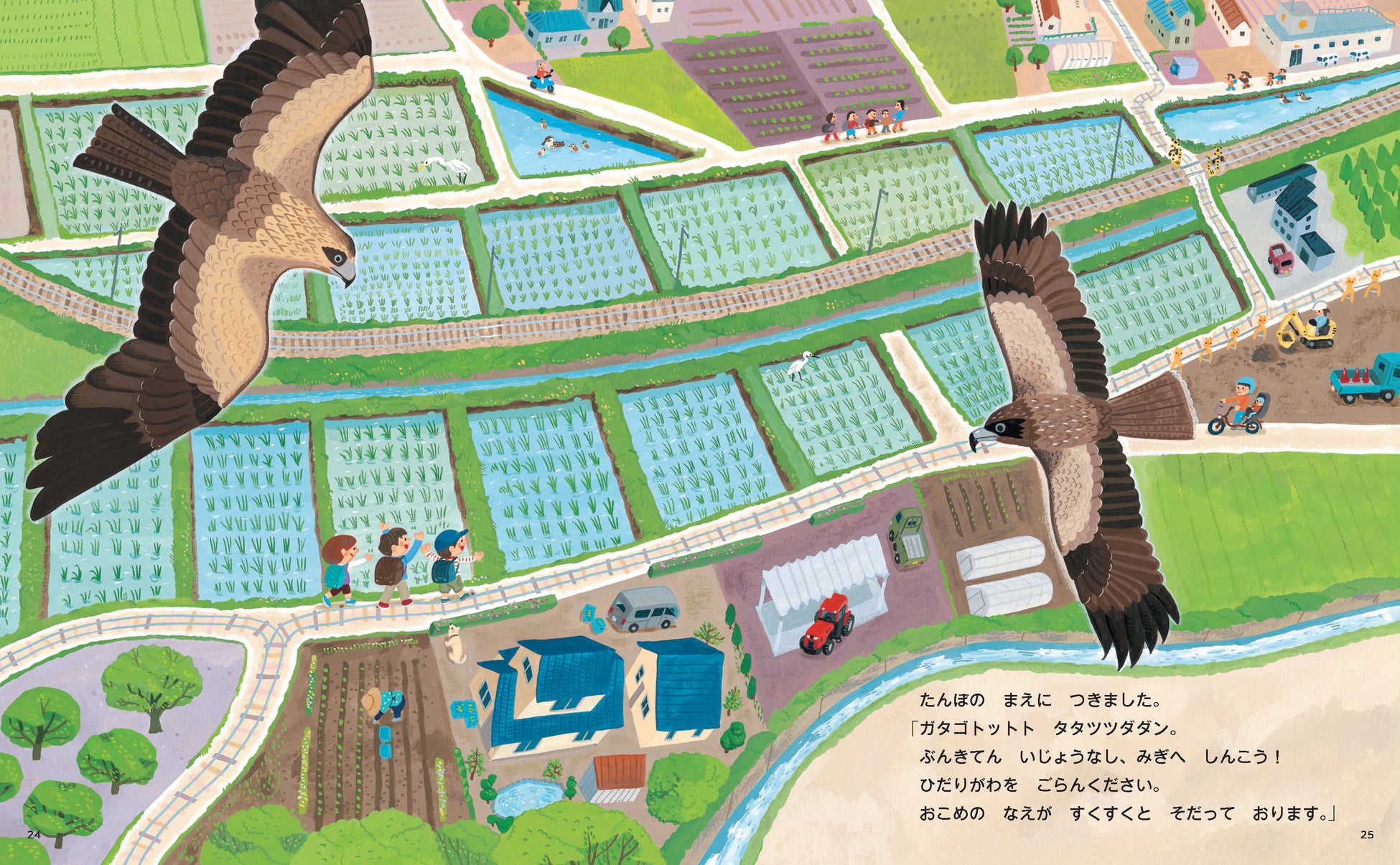 やさしく、どこか懐かしさを感じさせるタッチで、田んぼの広がる通学路や、風に揺れる草、朝の光に包まれた踏切の情景を丁寧に描いています。
