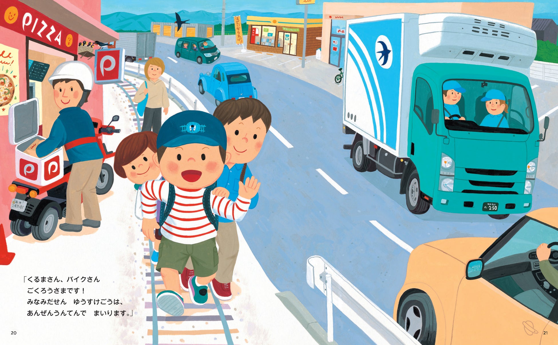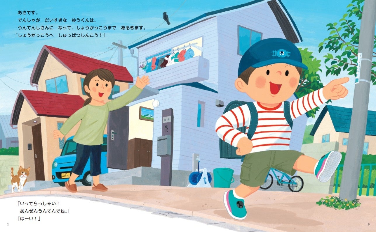 通学路に一歩踏み出した瞬間、ゆうくんは自分自身を電車に見立て、「みなみだせん ゆうすけ号」になって学校へ向かいます。