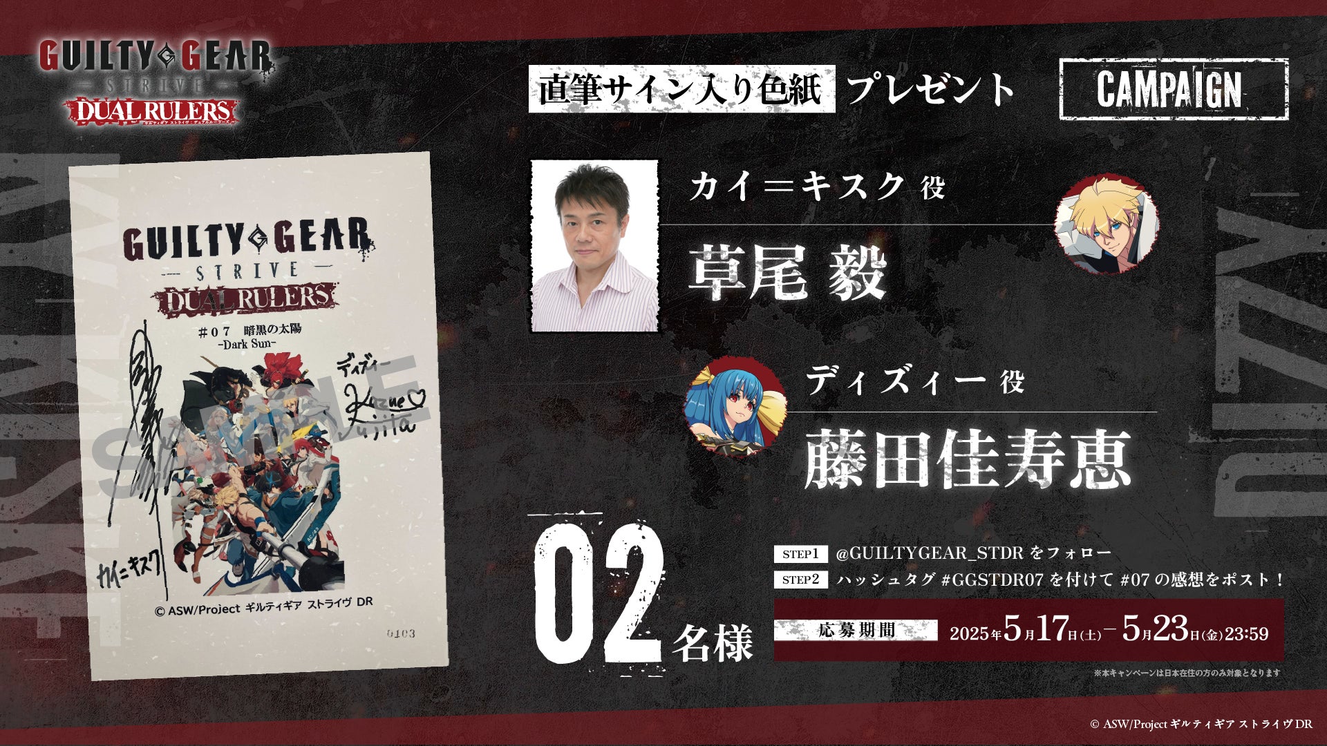 TVアニメ『GUILTY GEAR STRIVE: DUAL RULERS』#07放送を記念して、カイ=キスク役 草尾毅さんとディズィー役 藤田佳寿恵さんのサイン入り#07台本を、2名様にプレゼントいたします。