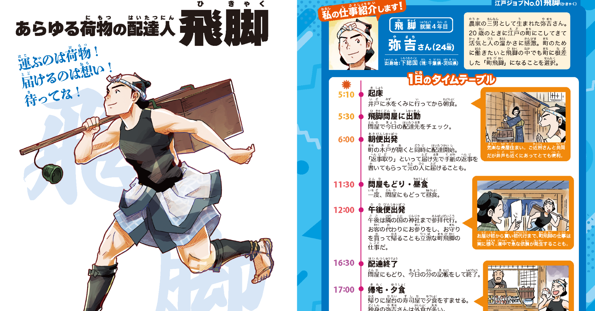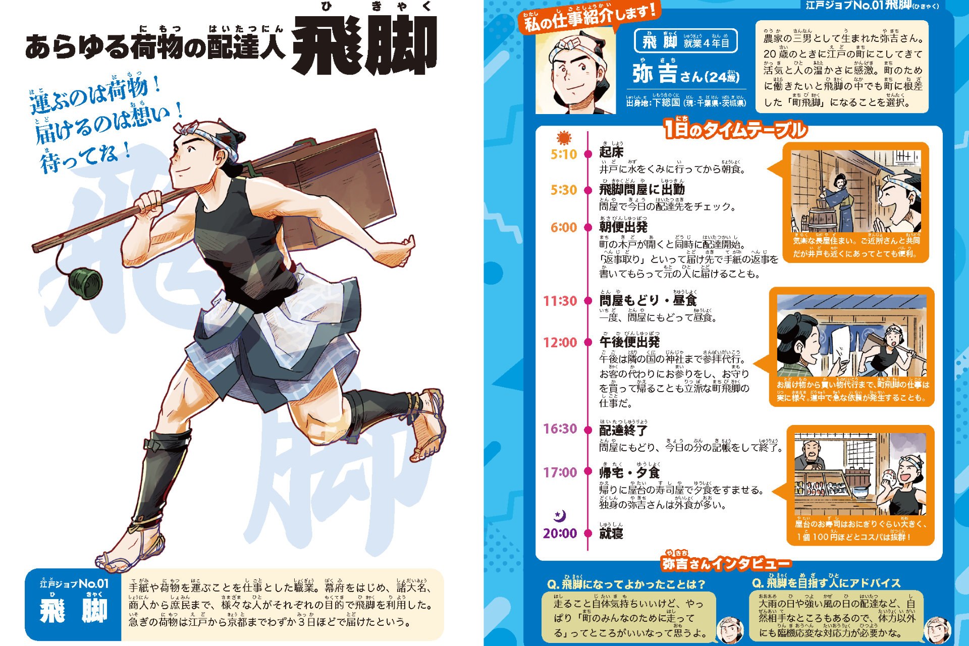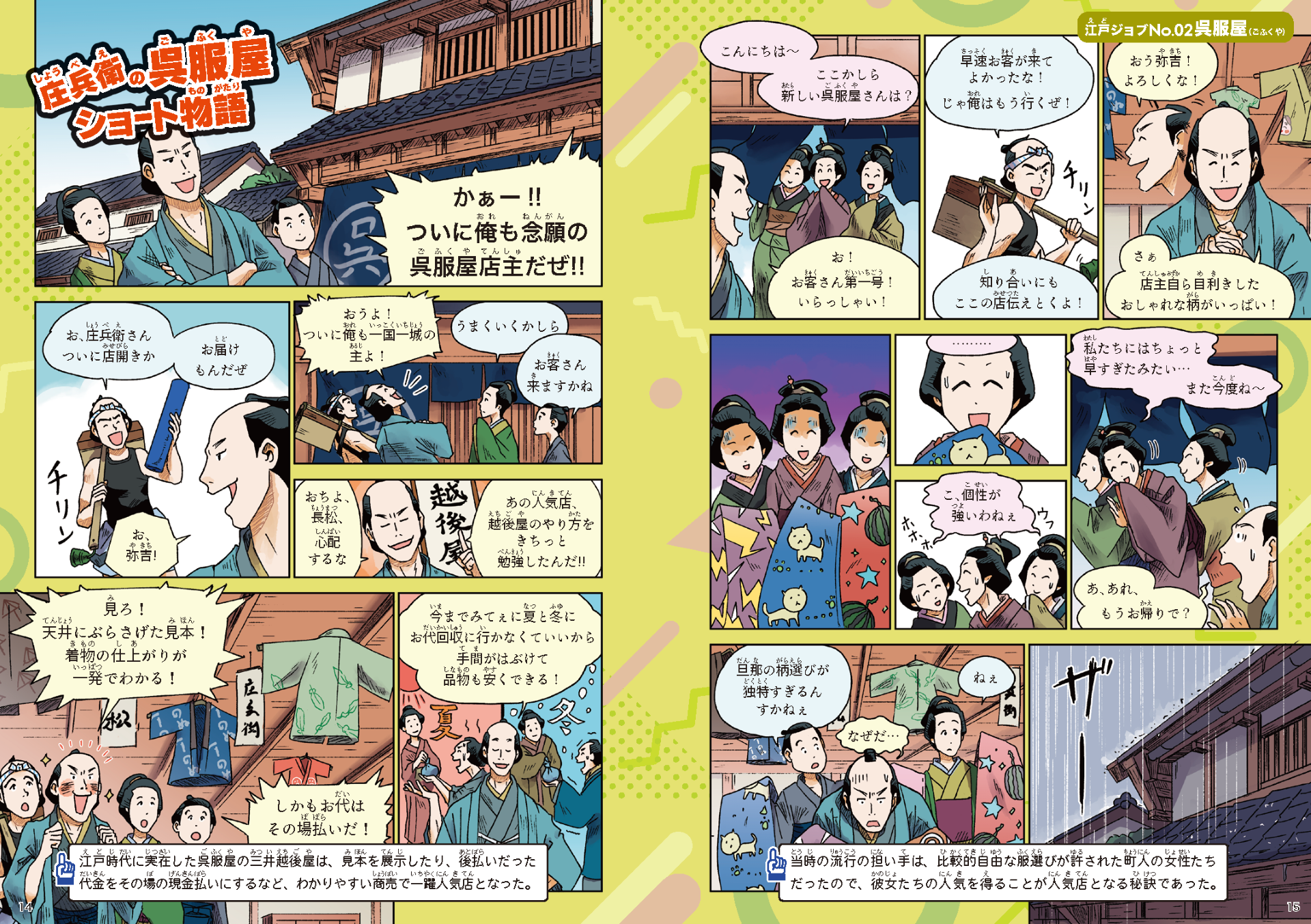 各職業に4〜6ページの本格マンガを収録しています。物語を読み進めることで、当時の仕事の様子や人々の苦労を、まるで自分も体験しているかのように自然と学べます。