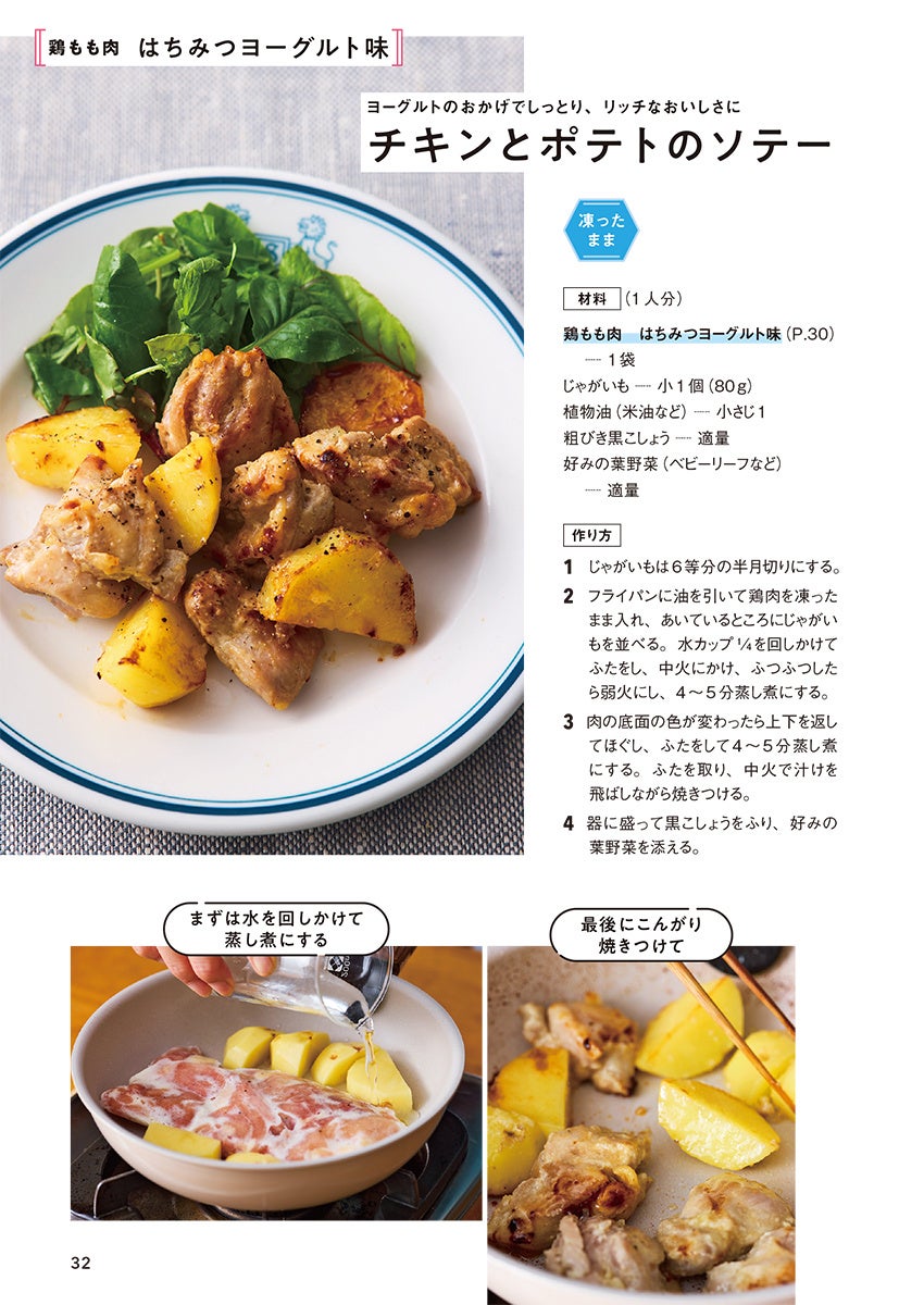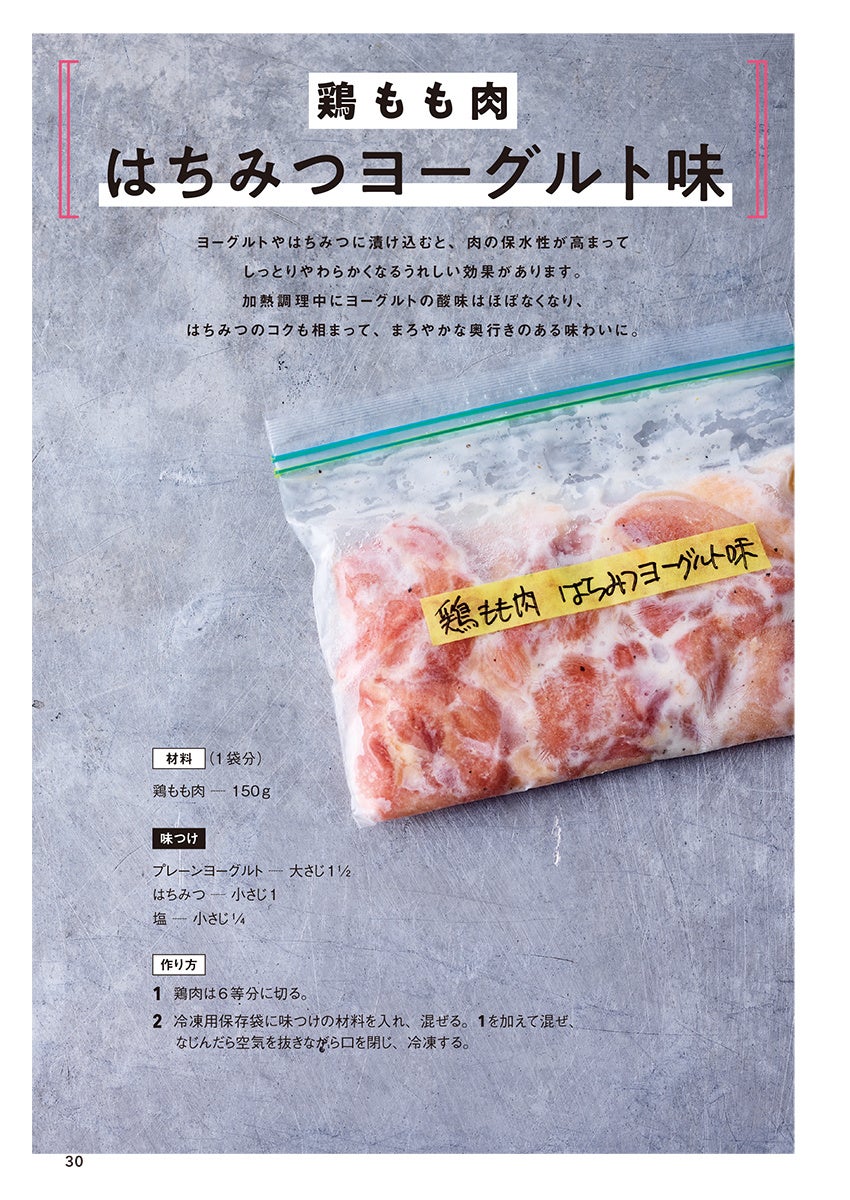 本書では、たんぱく質を味つけして冷凍する基本のストックに加え、必ず3通りのアレンジレシピを掲載。同じ素材でも飽きずに使い切れる工夫をしています。
