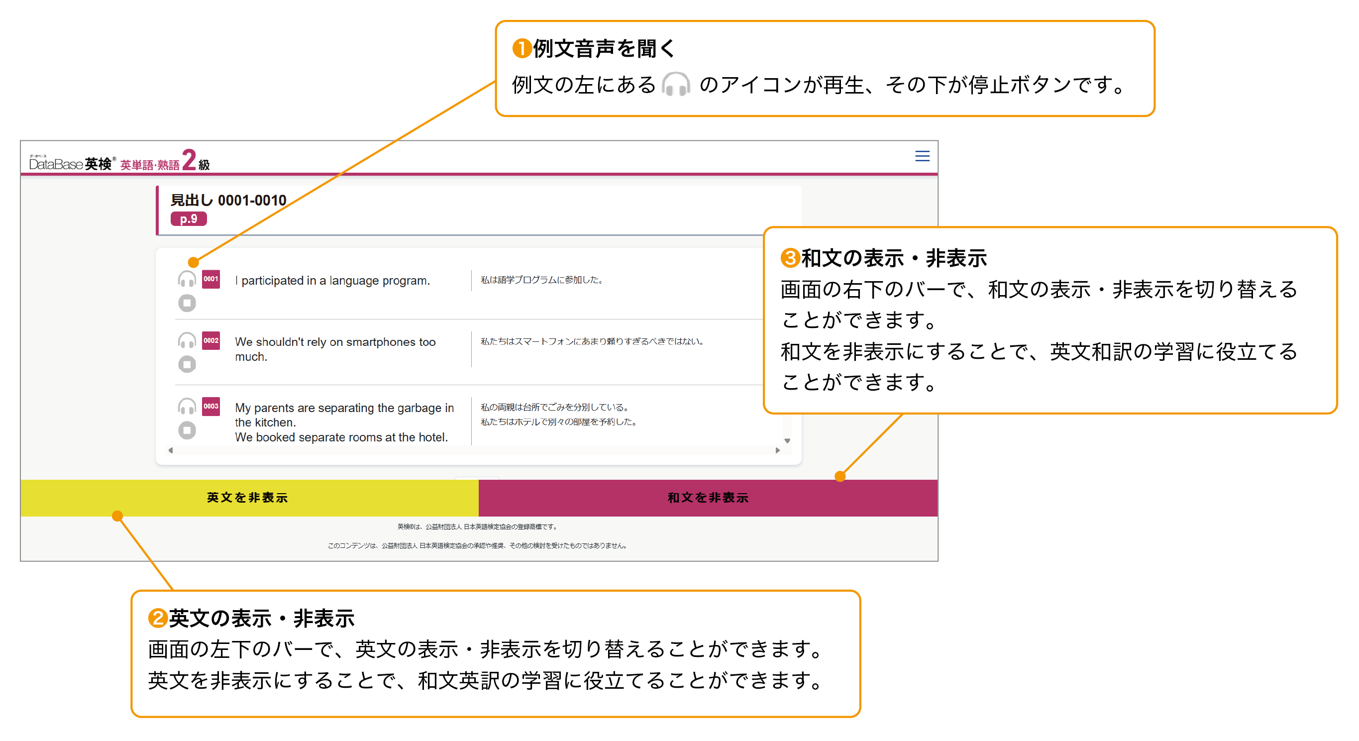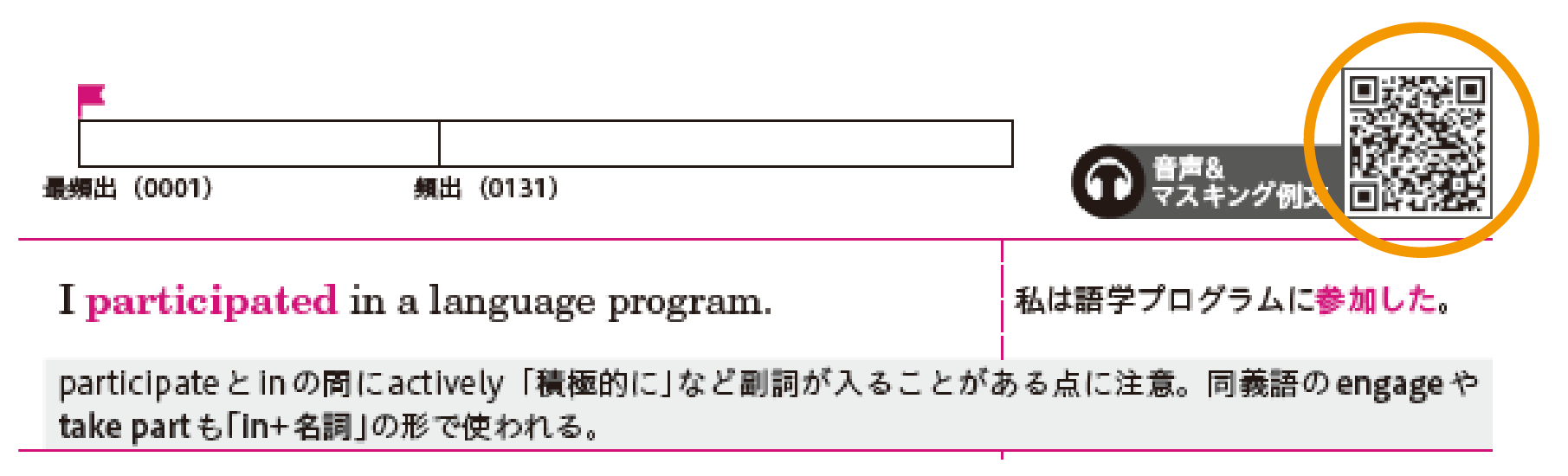 すべての見出し語には例文がついており、オンライン上でマスクリスニングに取り組めます。紙面右上の二次元コードからアクセスすることができます。