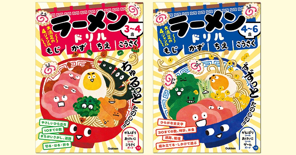 寒い季節のおうち時間にぴったり!「楽しさマシマシ! やる気アツアツ!」の『ラーメンドリル』。3~4歳・4~6歳の2冊が同時発売! もじ・かず・ちえ・こうさくの4ジャンルをバランスよく収録しています。