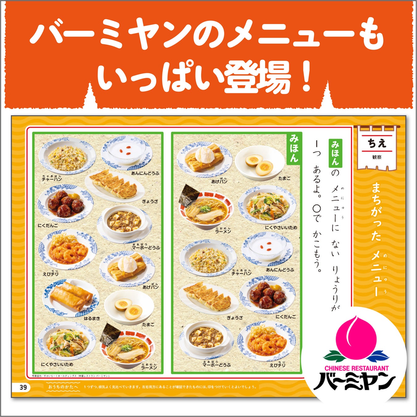 問題の中には、中華レストラン『バーミヤン』で実際に提供されているメニュー写真を使用したものも。「知ってる!」「食べたことある!」など、お子さんの興味が自然と引き出されます。