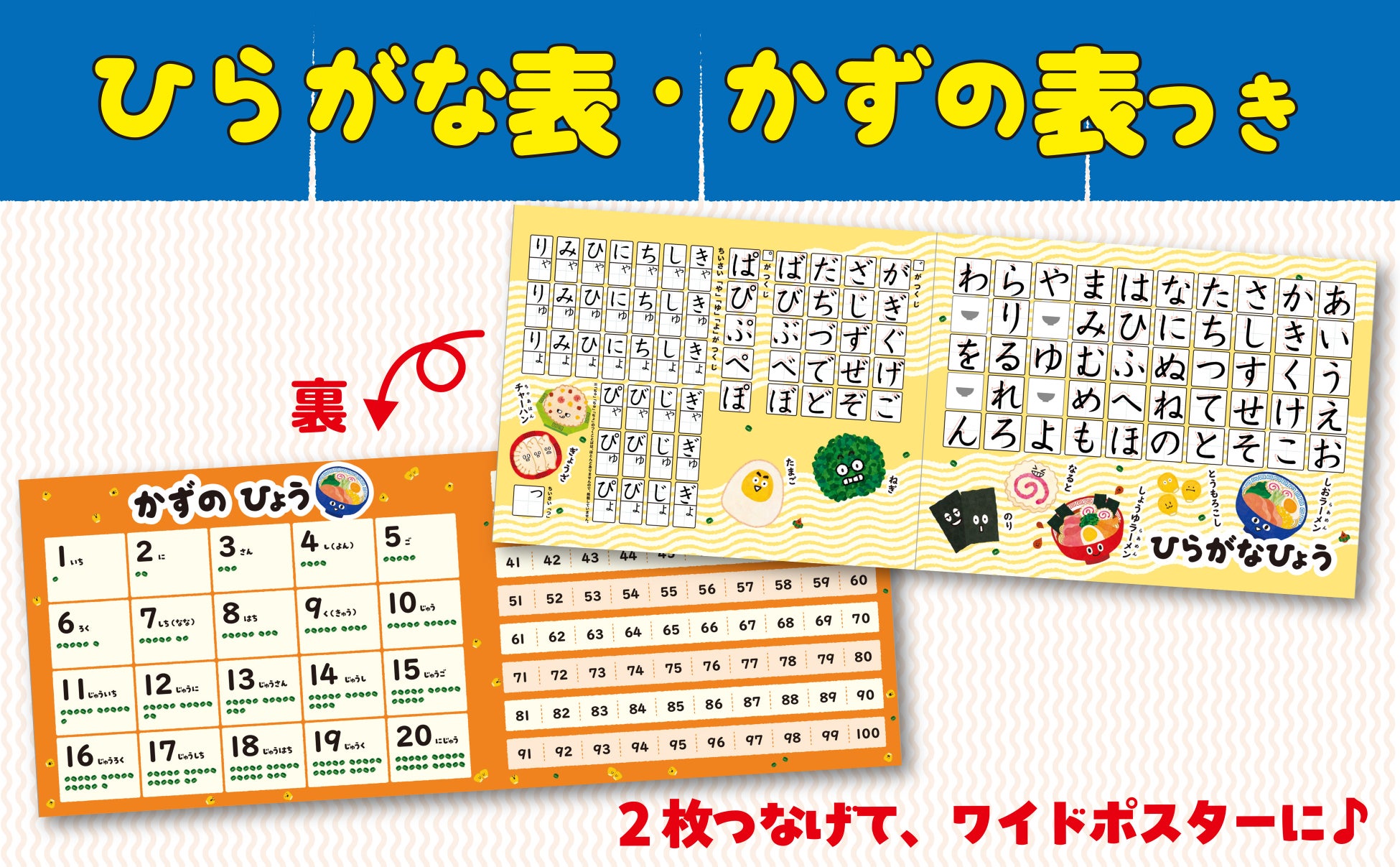 ひらがな表・かずの表つき。机や壁にはって、ページに出てきた文字や数字を振り返りましょう。