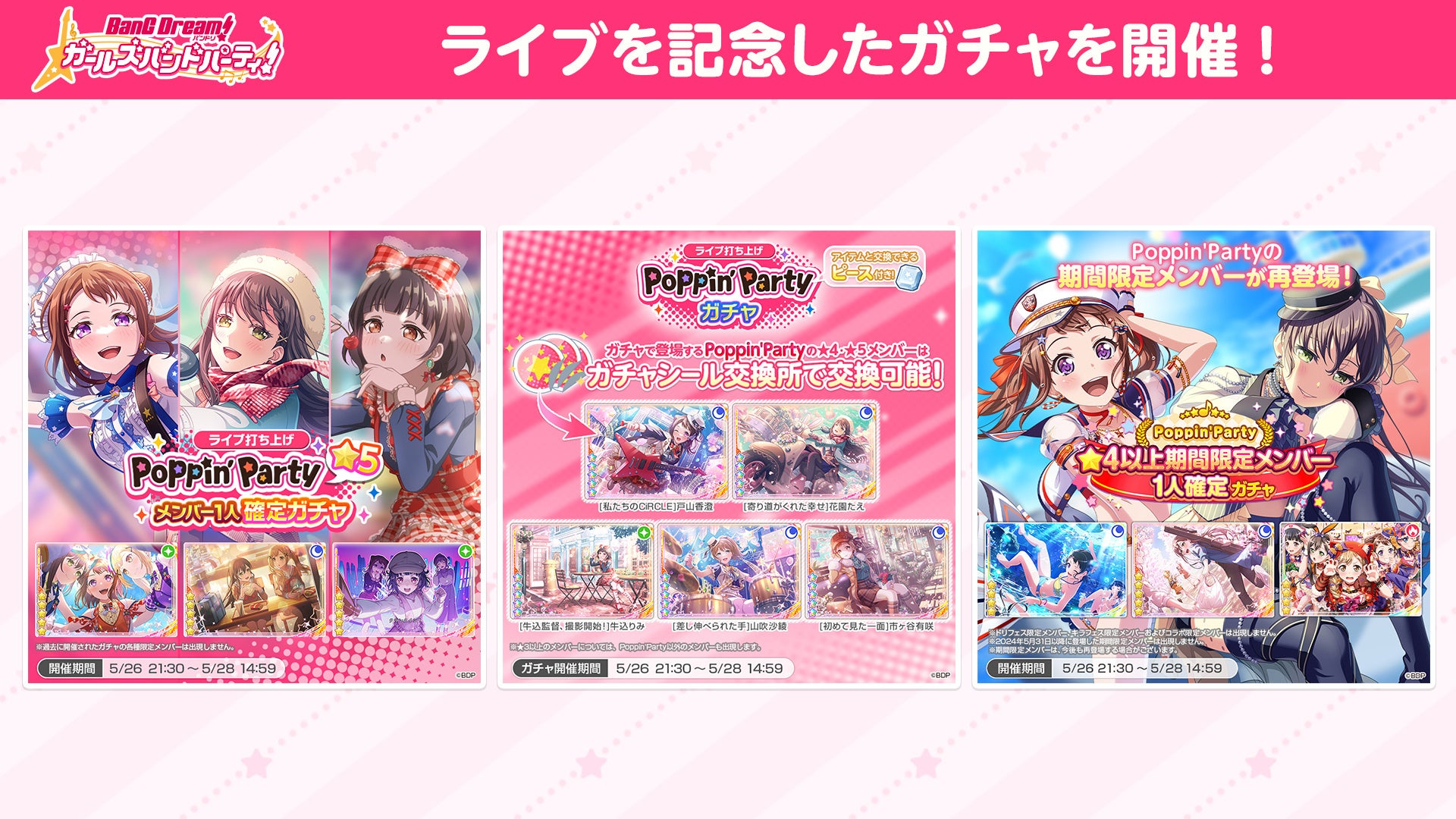 本ライブ開催を記念して、「ライブ打ち上げガチャ」が開催中です。Poppin'Partyメンバーの出現率がアップするほか、様々なアイテムと交換できるピース付きとなります。