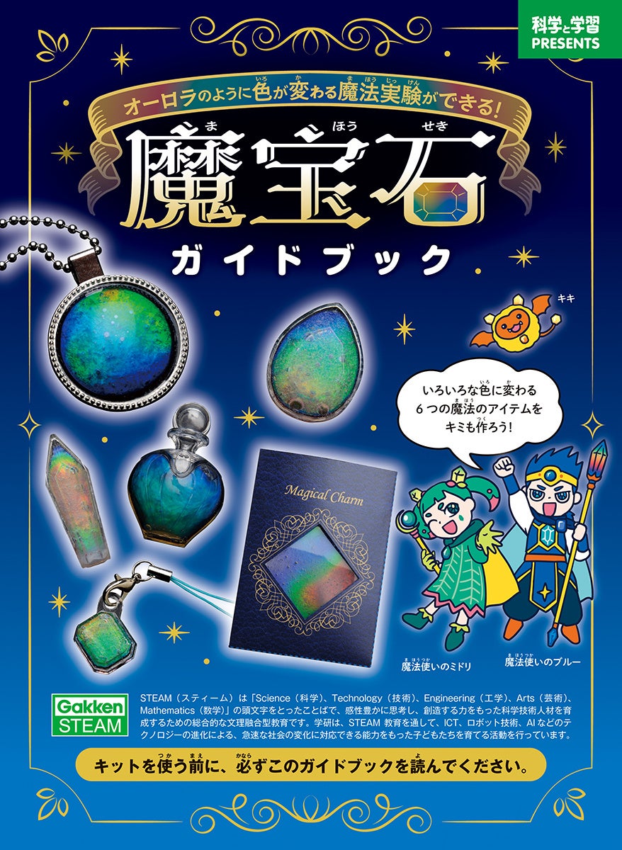 『科学と学習PRESENTS 魔宝石』は、不思議な素材を使って、オーロラのように色が変わる魔法実験ができるキット。温度や光などによって、さまざまな色に変わる6つの魔法アイテムが作れます。ガイドブックには、作り方と実験のやり方のほか、なぜそうなるかの科学的な解説が載っています。美しい「魔宝石」を作って遊びながら、科学を楽しく学べるSTEAM教材で、男女問わずおすすめのキットです。